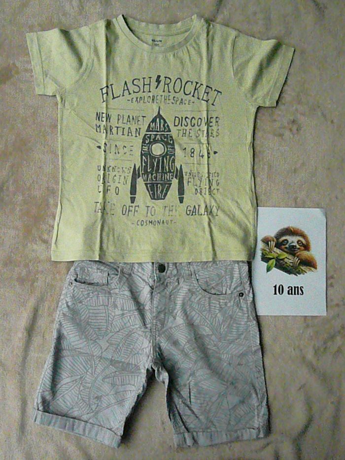 Ensemble taille 10 ans composé de : - 1 short gris avec ceinture réglable, - 1 tee-shirt vert à motif assorti. Très bon état. N’hésitez pas à regarder mes autres annonces pour réduire les frais de port.