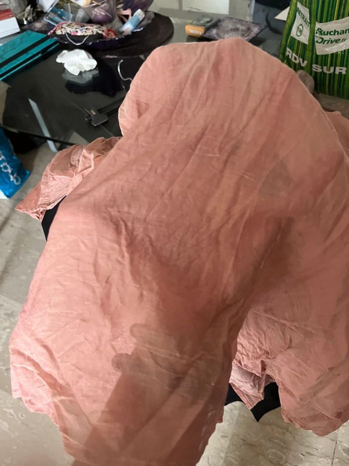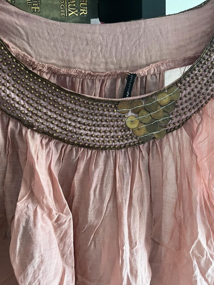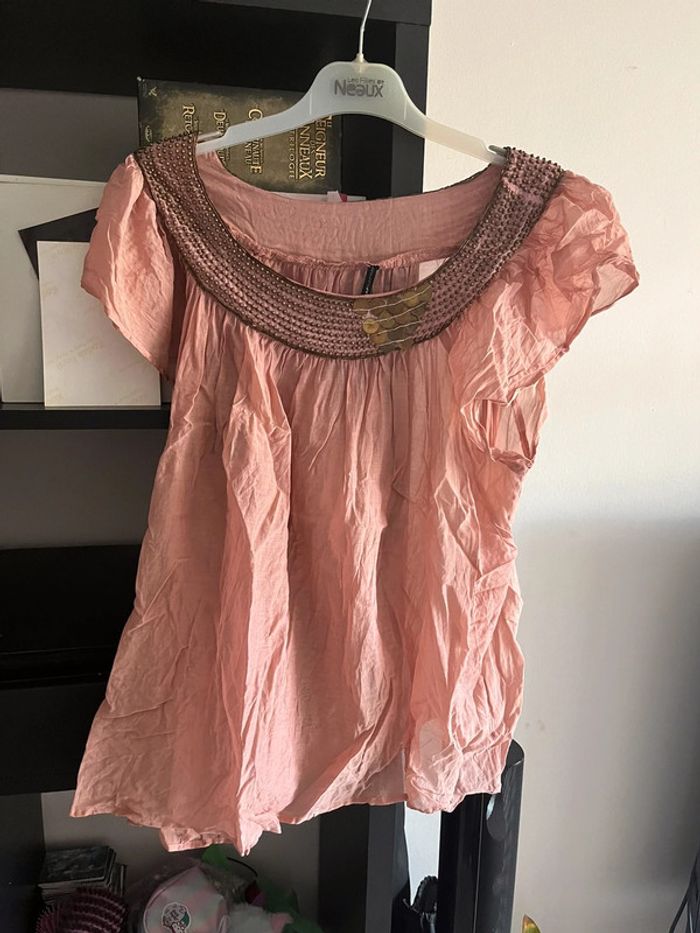 Tunique été transparente taille 38 en soie et coton Tout le col est en perle et pièce métallisés 🤑 Promotion activé N hésitez pas à faire des lots jusqu a 25% des 5 articles achetés