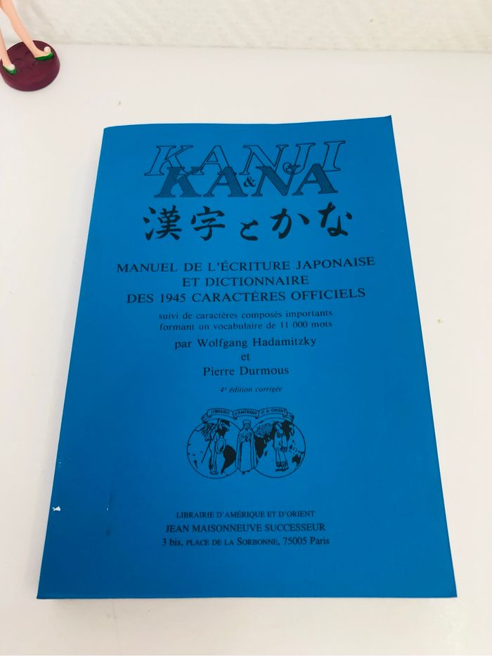 - Titre : Kanji & Kana - Manuel de l'écriture japonaise et dictionnaire des 1945 caractères officiels suivi de caractères composés importants formant un vocabulaire de 11 000 mots - Auteur : Wolfgang Hadamitzky et Pierre Durmous - Éditeur : Jean Maisonneuve Successeur - Année d'édition : 4ème édition - Genre : Apprentissage de l'écriture japonaise Très bon état, des légers défauts sur la couverture voir photos