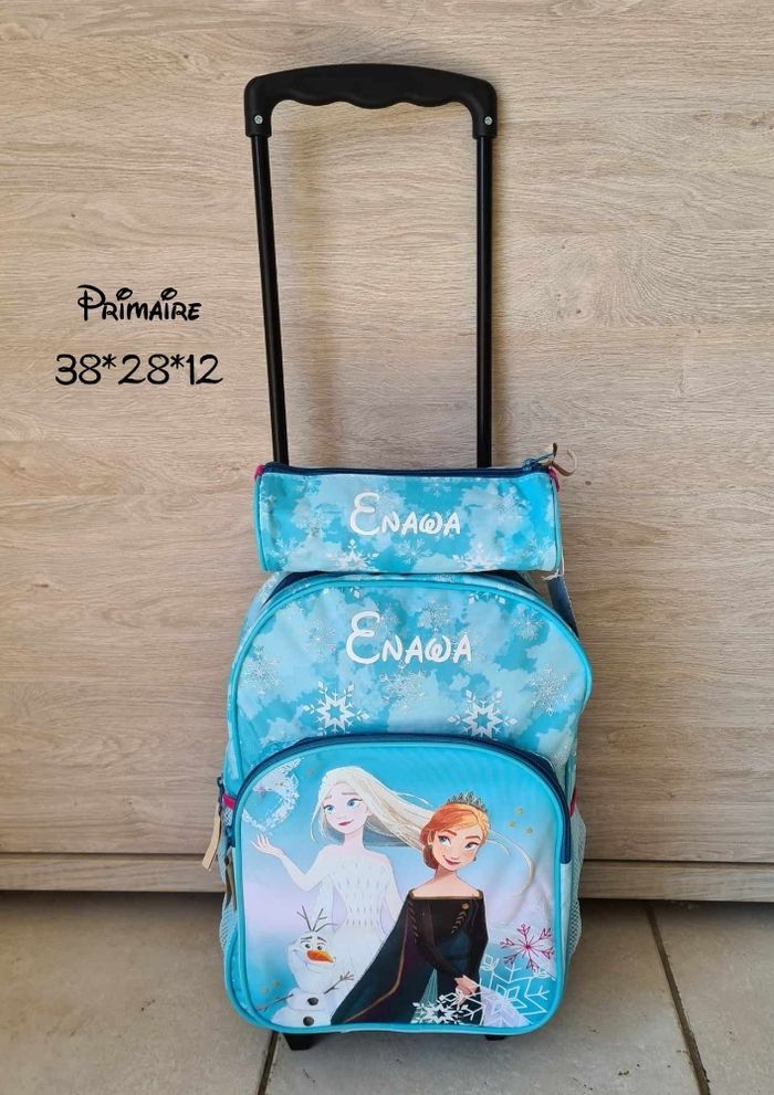 Sac personnalisé reine des neiges, à roulettes + trousse assortie Pour primaire Dimensions 38x28x12 Ecriture et couleur du prénom modifiable Envoi rapide