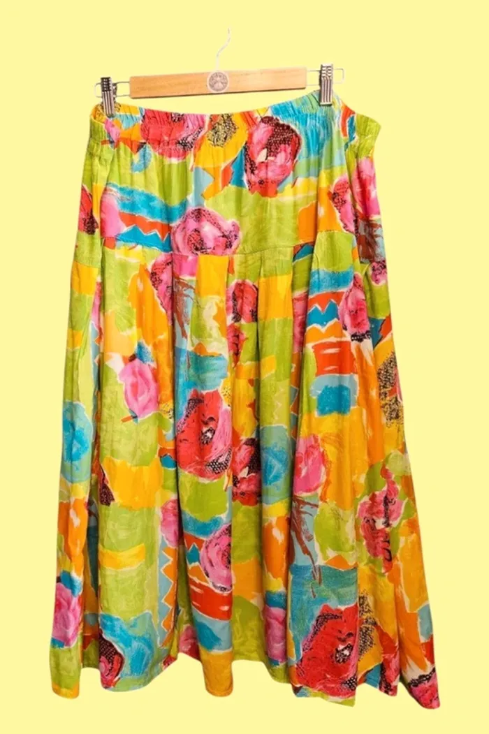 📸 Photo principale générée par IA pour mieux visualiser le rendu porté. ⚠️ Le modèle réel peut légèrement différer. Merci de bien consulter les photos suivantes pour voir l’article réel. Vend Jupe fluide colorée, bon état. Bouloche un peu. Longueur milieu dos 79cm Taille à plat 46cm Taille élastiquée, au plus large 57cm PAS D'ENVOI VINTED GO! #plussize #grandetaille #jupefemme50 #jupeété50 #jupecoloree50 #femme50 #laboutiquedekatmin50