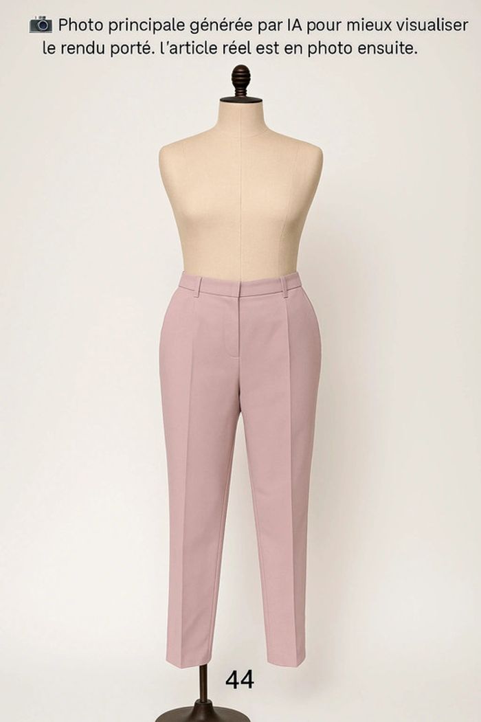 📸 Photo principale générée par IA pour mieux visualiser le rendu porté. ⚠️ Le modèle réel peut légèrement différer. Merci de bien consulter les photos suivantes pour voir l’article réel. Vend Pantalon, très bon état. Longueur entrejambe 69cm Taille à plat 45cm, taille élastiquée sur les côtés. PAS D'ENVOI VINTED GO! #plussize #grandetaille #pantalonfemme44 #pantalonparme44 #bleubonheur44 #femme44 #laboutiquedekatmin44