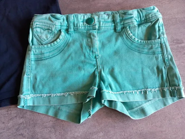 Ensemble en très bon état. Tee-shirt bleu marine 100% coton. Short vert clair coton/elasthanne. Taille réglable. Taille 10 ans.