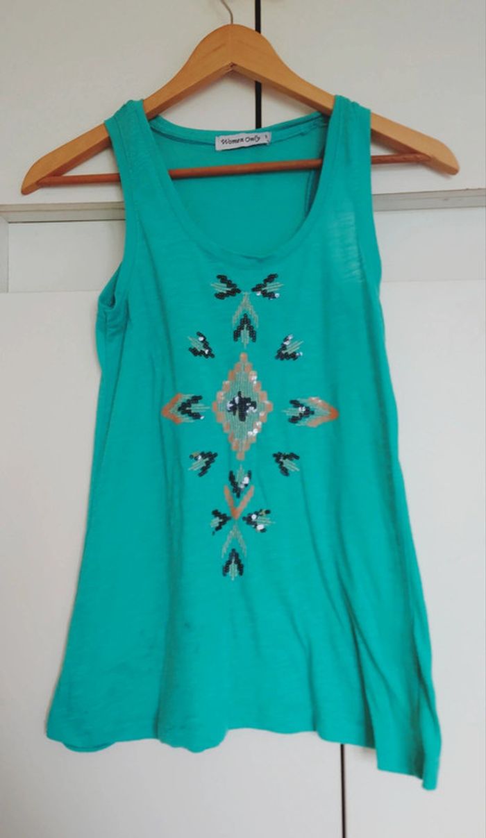 Débardeur vert à motifs Taille 36 Marque Women Only ⚠️ Tâches, voir photos #dressinggrac3vetementsfemmetaille36 #debardeur36