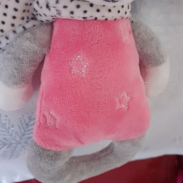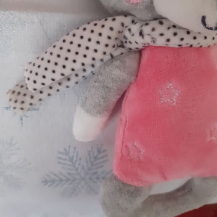 Doudou-peluche entièrement rembourré; yeux et museau brodés; oreilles doublées; écharpe non amovible. Bruit de grelot quand on le secoue et bruit "pouet-pouet " quand on appuie sur le ventre. Hauteur maxi de 20 cm // voir photos pour détails. À Noter : étiquette coupée