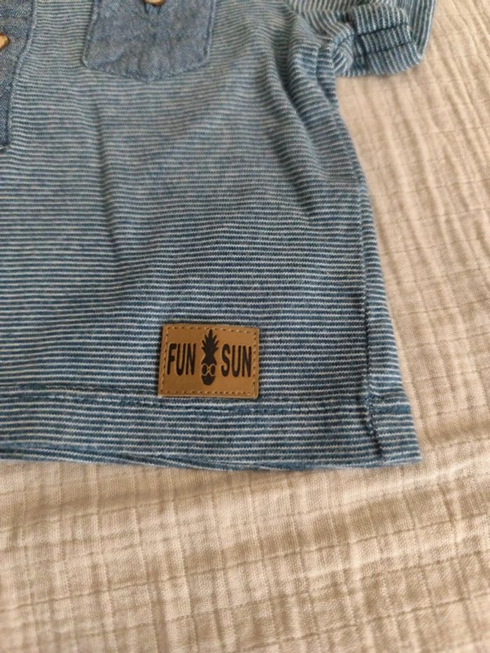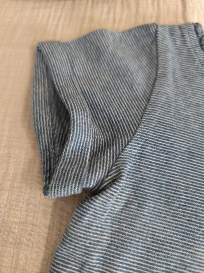 Tee-shirt bleu jean rayé blanc boutons encolure, petite poche poitrine, rabat aux manches. Je le met en 56cm car il taille petit comparé au autre de la même marque (épaule 17cm, hauteur 23cm, sous bras 22cm) #olina1erage3 #olina1erage
