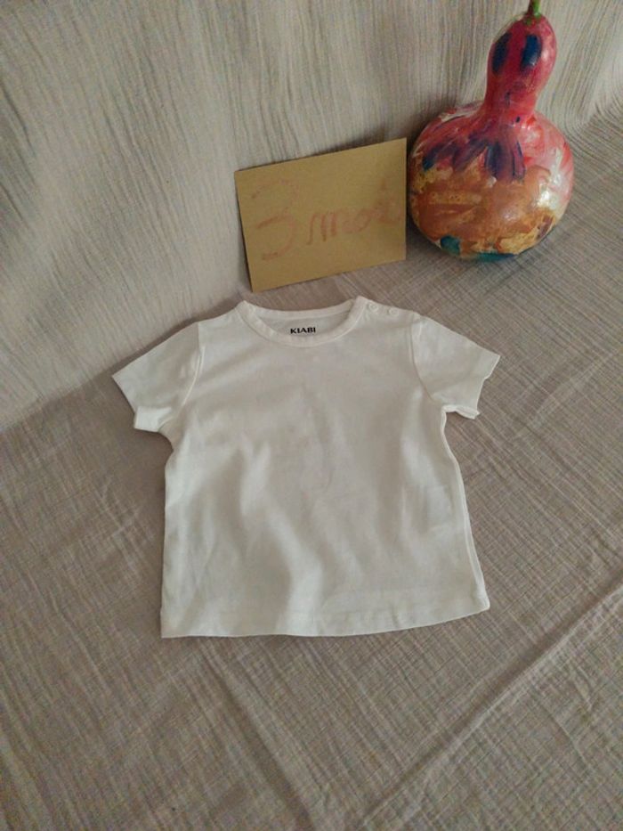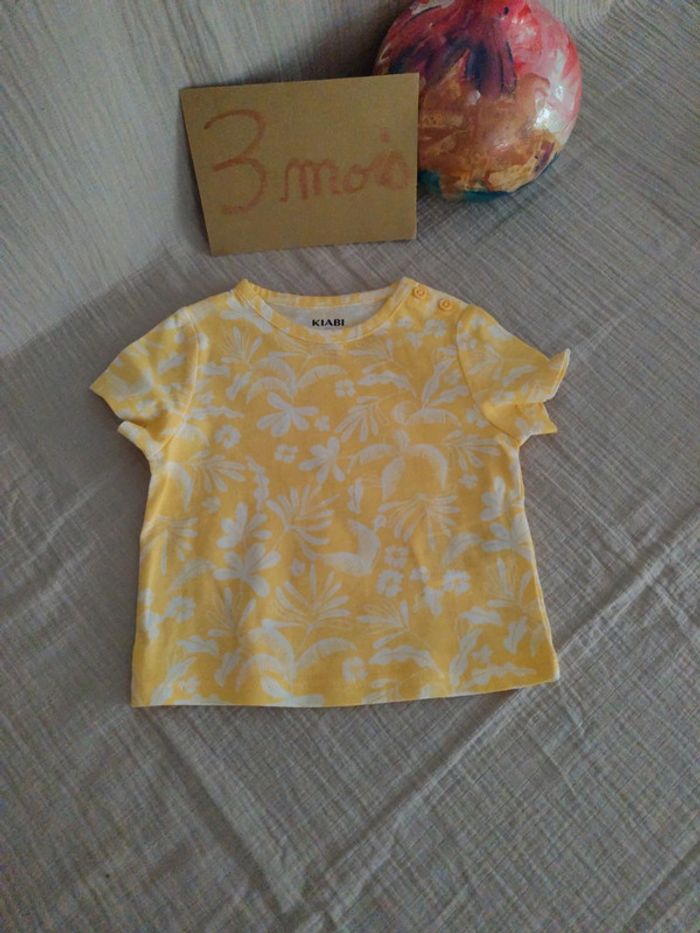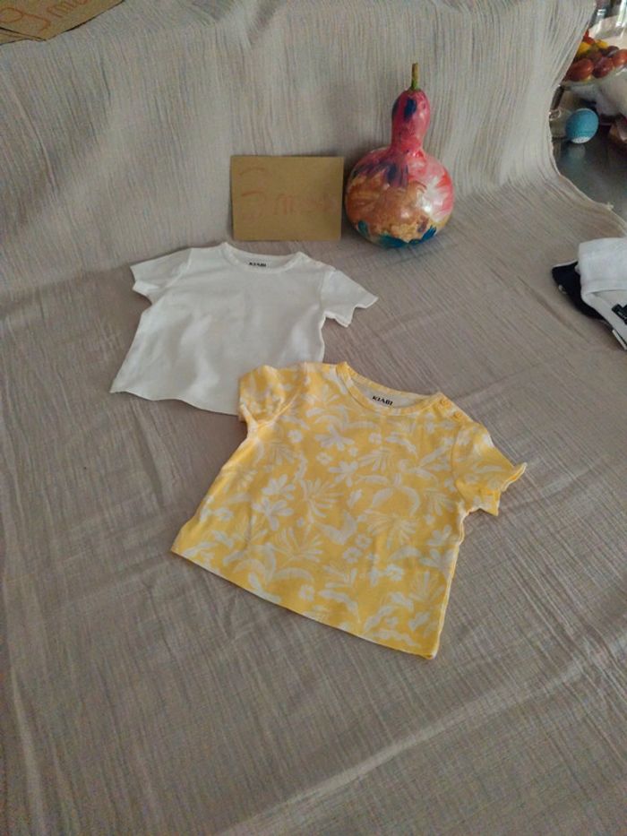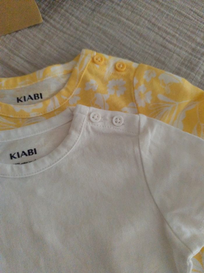 2 Tee-shirts de chez Kiabi, 2 boutons sur l'épaule, 1 blanc, 1 jaune feuillages blanc pour bébé 6kg #olina1erage3