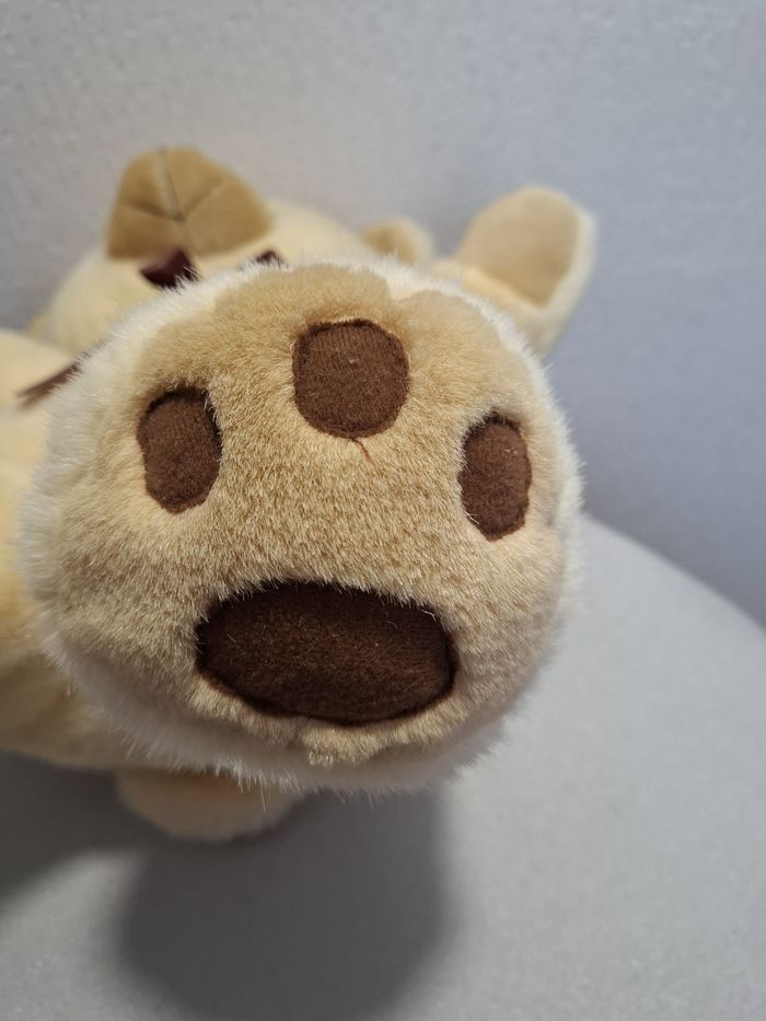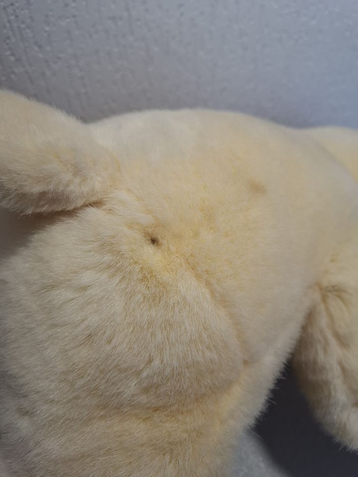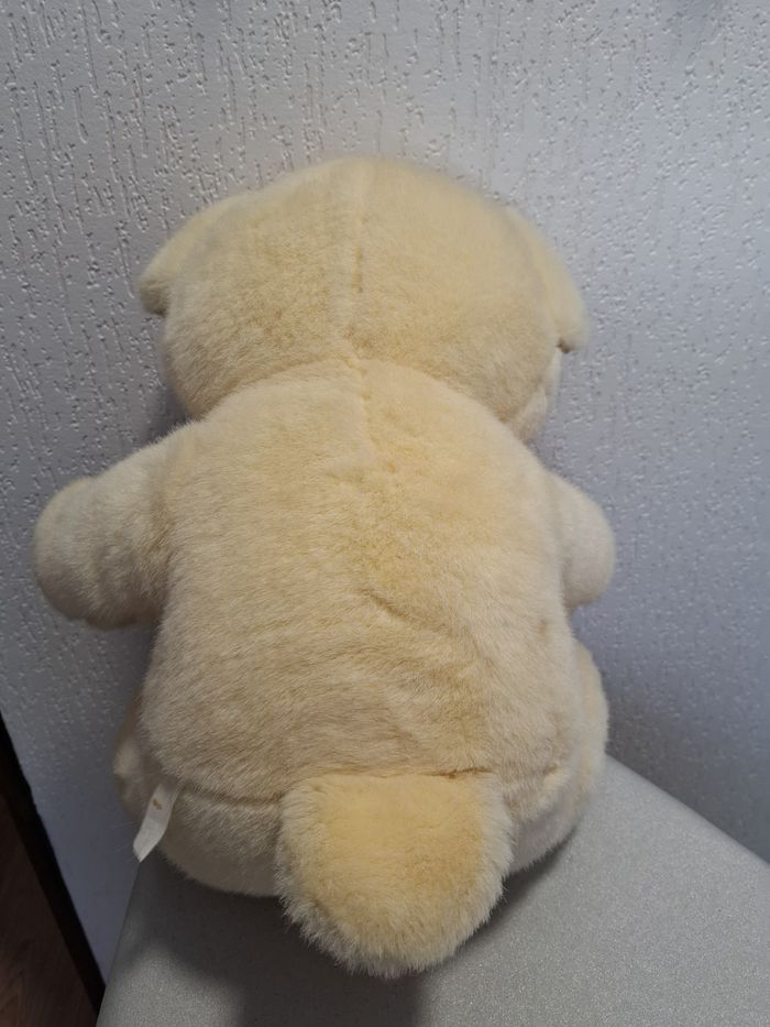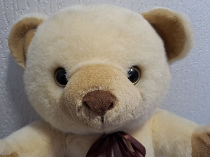 Belle et grande peluche ours beige et marron toute douce, yeux sécurisés, 50 cm, en 100 % polyester, n'a servi qu'en décoration dans une chambre, elle est en très bon état hormis une petite tâche sur la droite de la queue, à l'arrière.