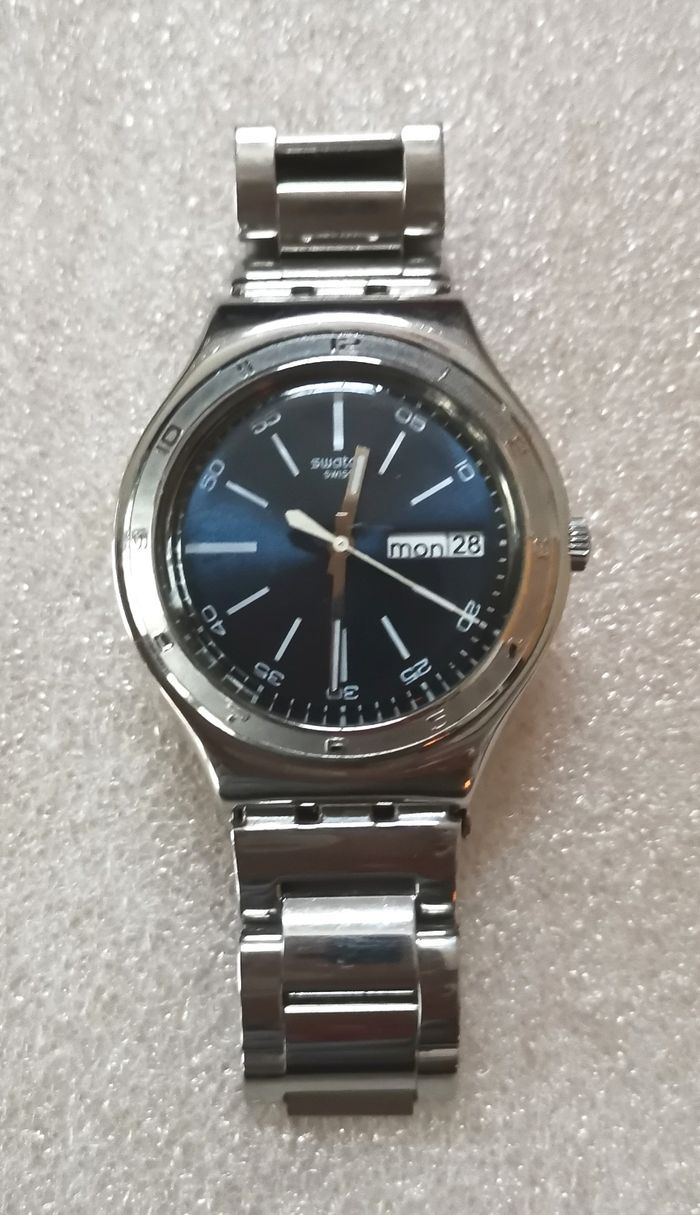 Montre SWATCH Collecteur "Blue Decency" , Collection Irony Big YGS 751, boîtier rond de 37 mm en acier argenté à intérieur bleu, affichage analogique, chiffres blanches aiguilles argent et trotteuse blanche, et bracelet acier assorti, en parfait état de fonctionnement, pile fourni, prix définitif.