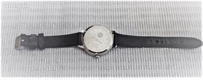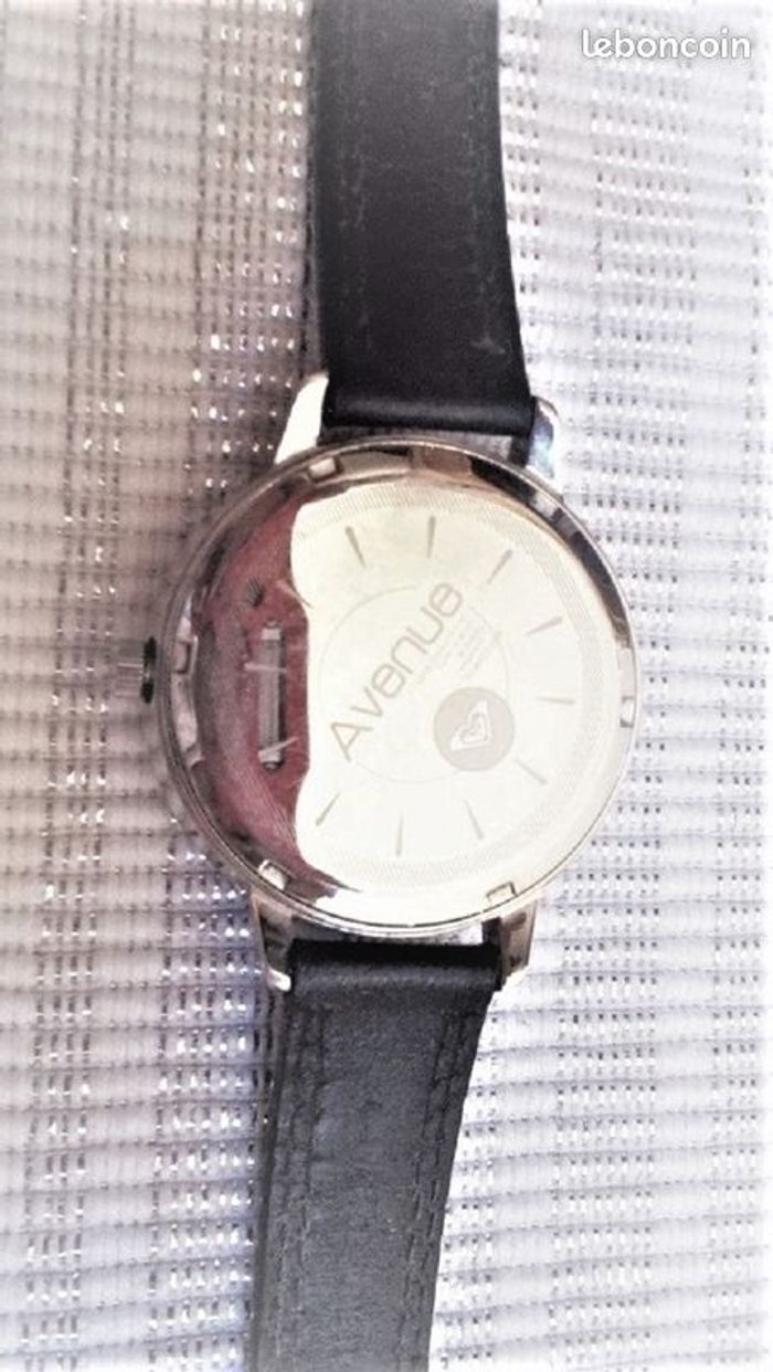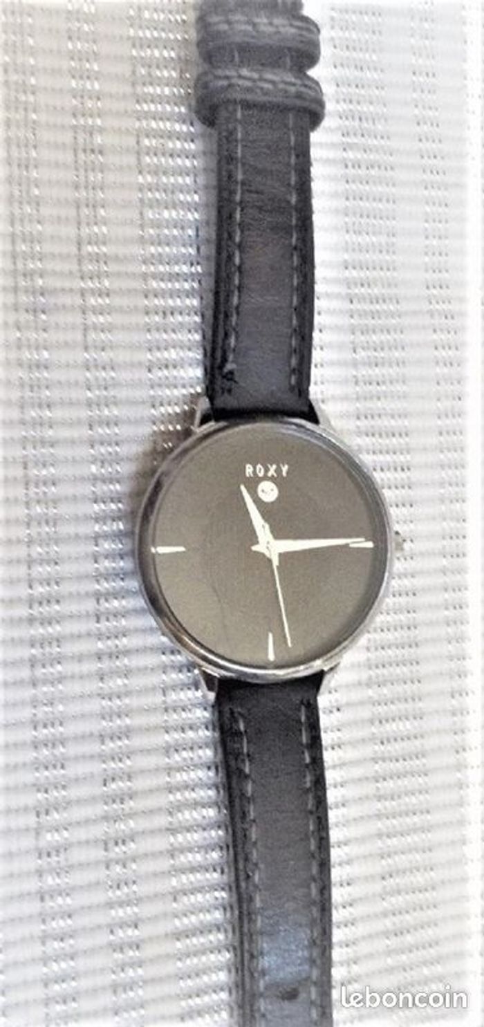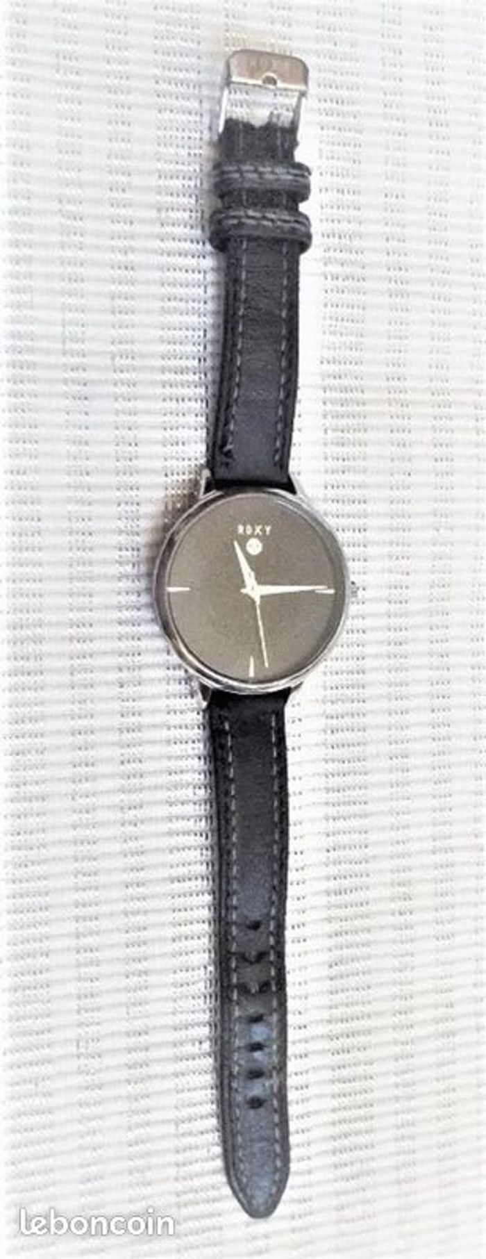 Montre Roxy "Avenue", boîtier en métal argenté de 3,5 cm, intérieur noir, aiguilles et trotteuse argent, et bracelet en cuir couleur noir assorti, en parfait état de fonctionnement, pile fourni, prix définitif.