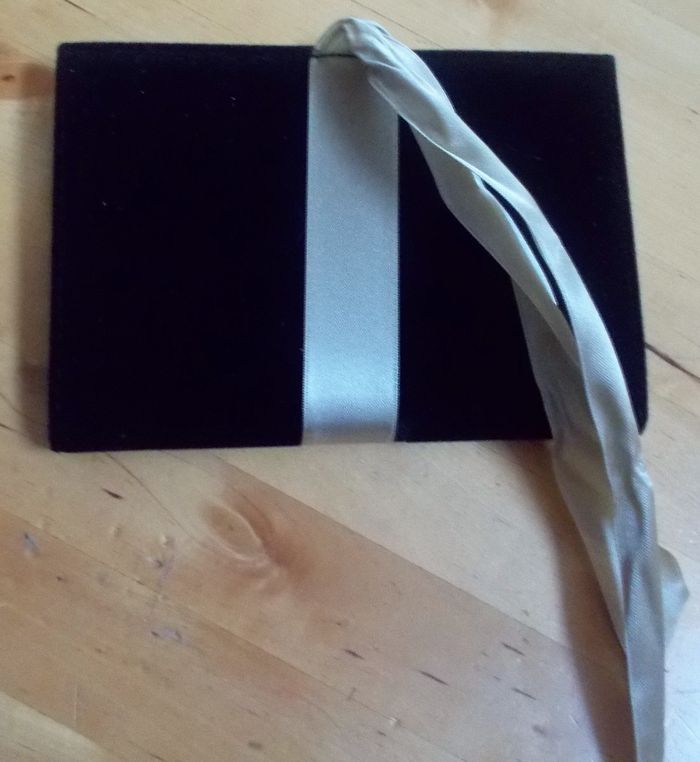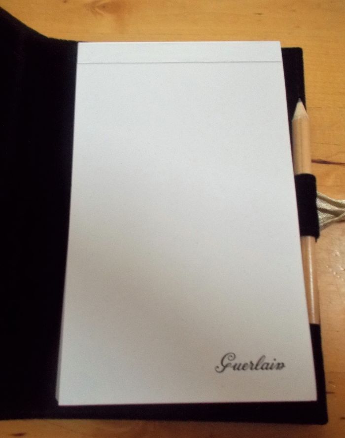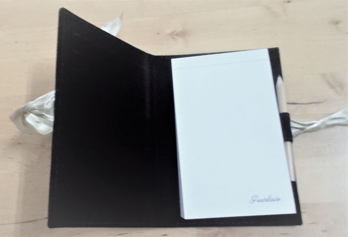 Bloc notes Collecteur "Guerlain", couverture en velours couleur noir à ruban argenté à nouer, pages blanches, dimensions :17 cm x 12 cm, neuf, prix définitif.