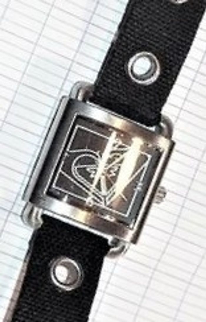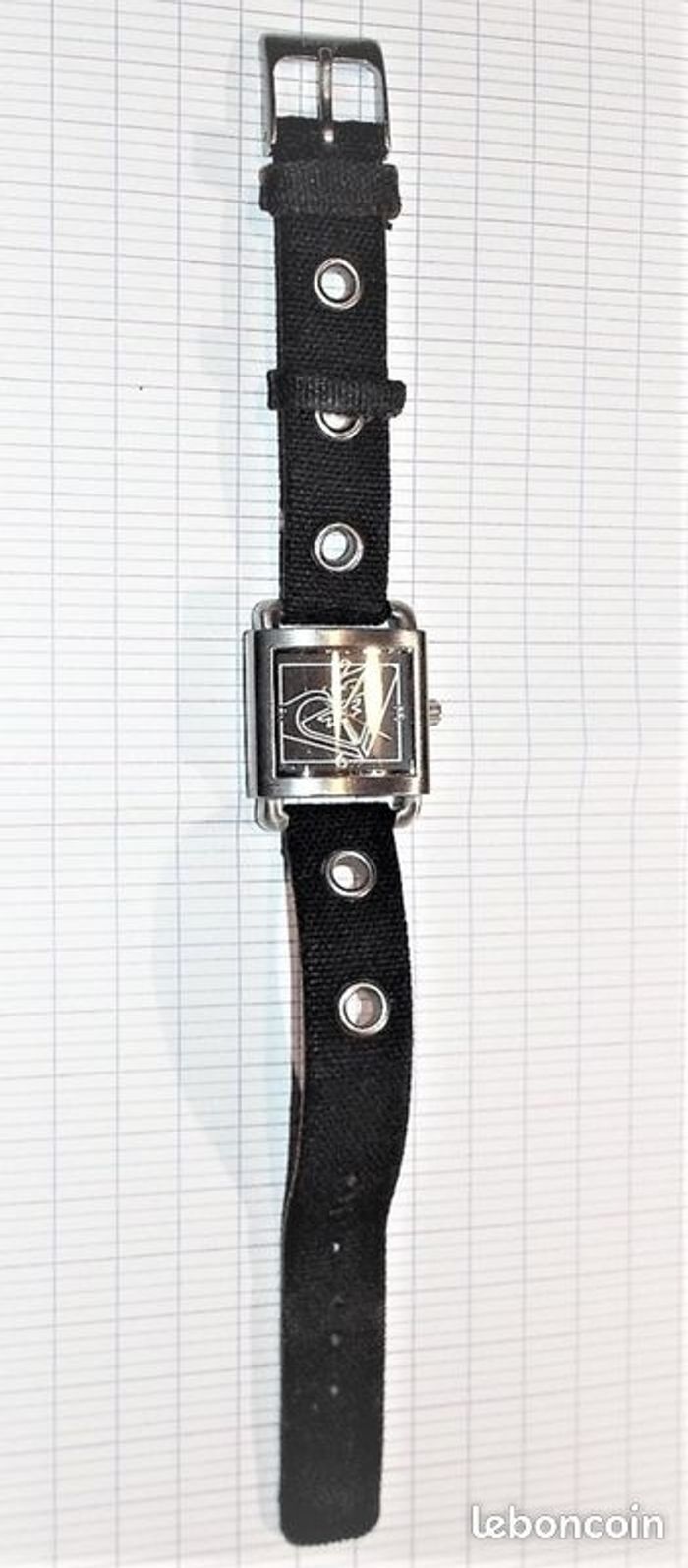 Montre ROXY "Business Class", boîtier carré en acier argenté, intérieur noir à logo et aiguilles argent, et bracelet textile sur cuir couleur noir assorti, fonctionnante, pile fourni, prix définitif.