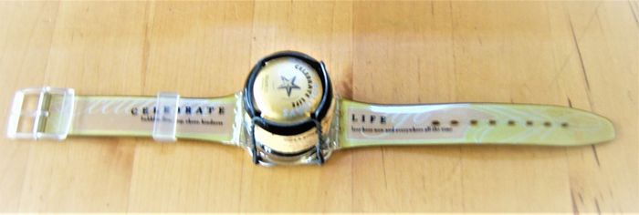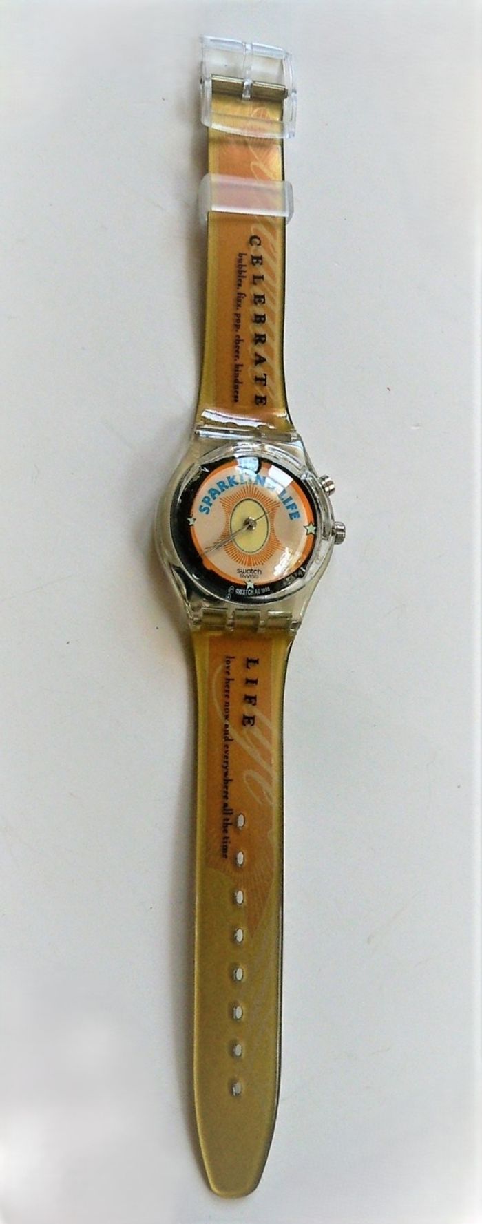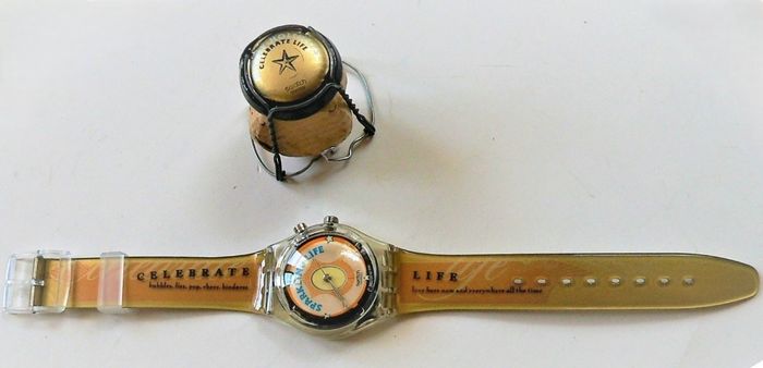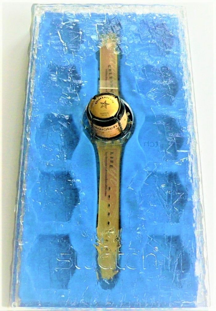 Pack Collecteur SWATCH Christmas Collection "Sparkling Life" GZ 902, Edition Limité à 30.000 pièces, boitier de 33 mm, à intérieur noir, orange et jaune, texte écrit en bleu, aiguilles argent, étanchéité: 3 Bar, bracelet en résine assorti, en parfait état de fonctionnement, pile fourni, prix définitif.