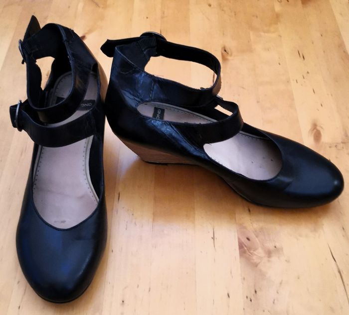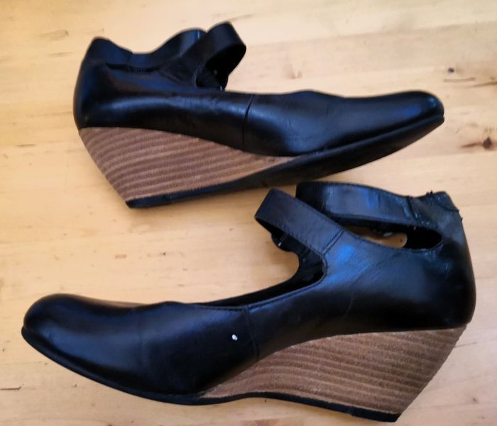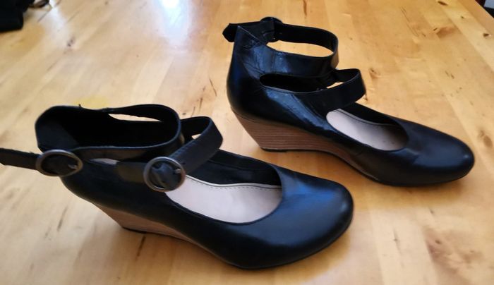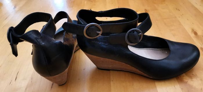 Escarpins "Vagabond", en cuir couleur noir, fermeture à brides, talon plateforme de 6 cm, pointure 36, tbé.