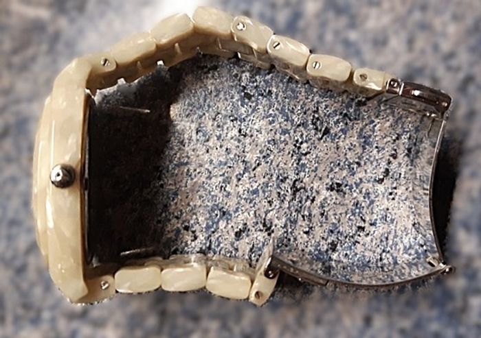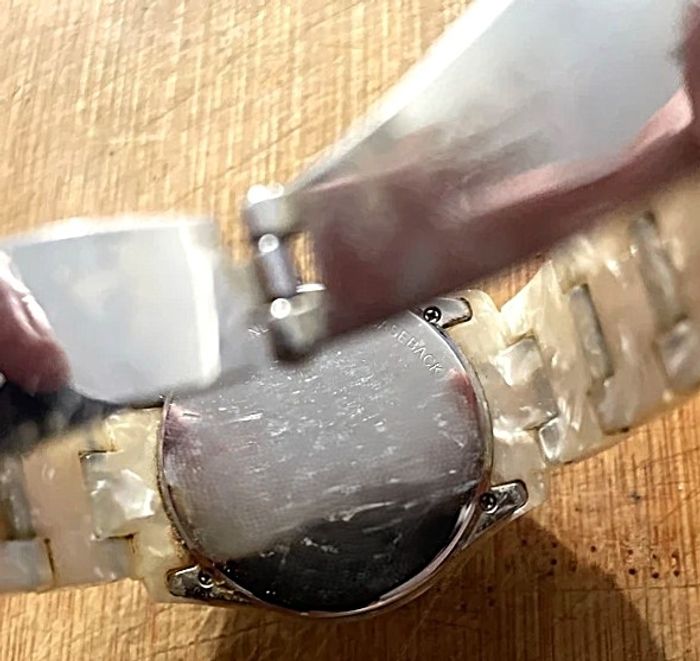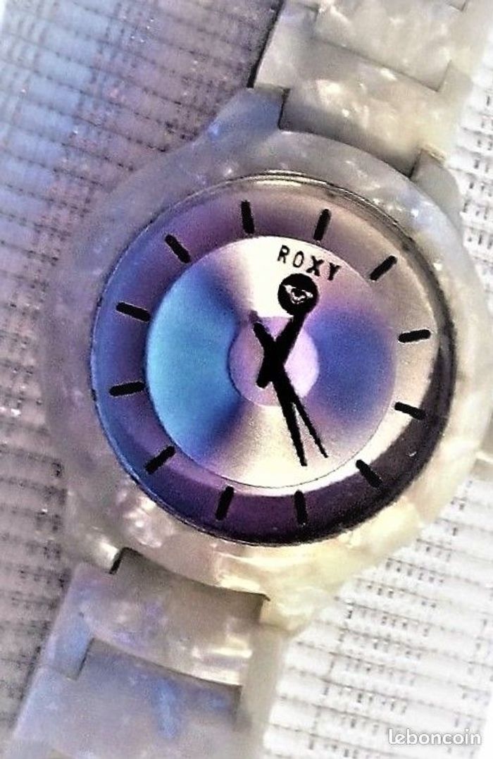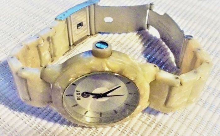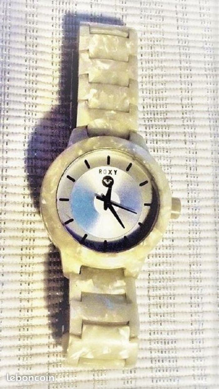 Montre ROXY "Baroness", boîtier écaille nacré couleu crème de 35 mm, intérieur miroir, aiguilles argent, et bracelet assorti, fonctionnante, pile fourni, prix définitif.
