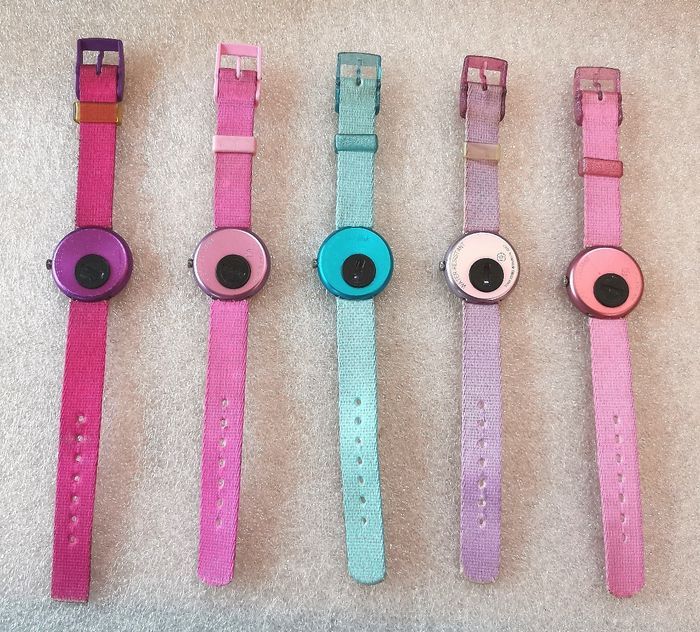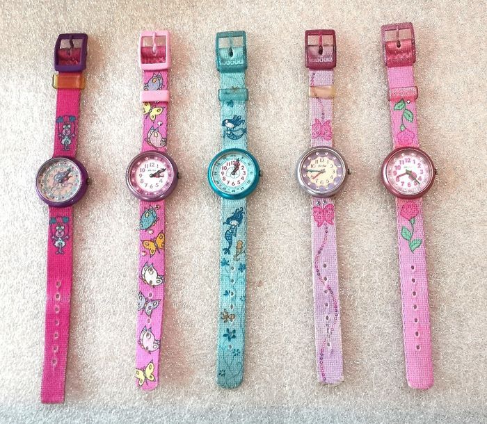 Montres Flik Flak Collecteur (Swatch), 5 modèles à motifs différents, portées, peuvent présenter des traces d'usure, voir griffures, pas de défauts majors à signaler, fonctionnantes, piles fournis, au choix 30 euros chacune, l'unité, prix définitif, merci de confirmer votre choix à la commande.