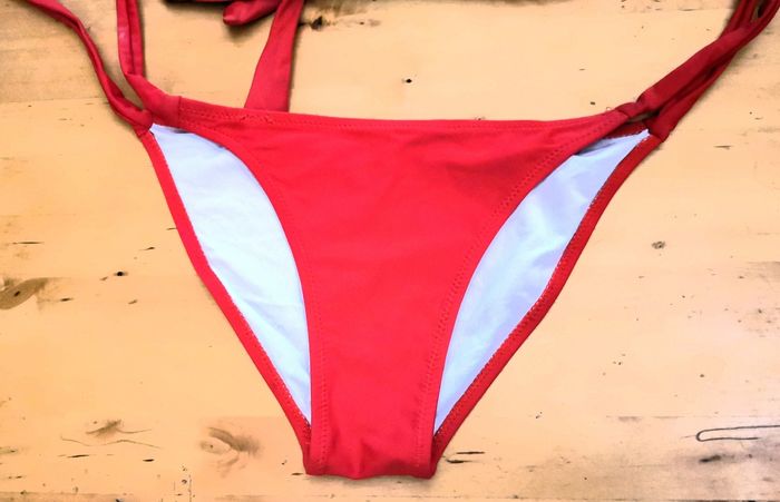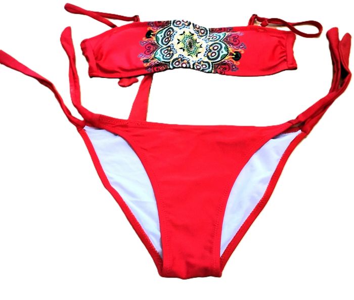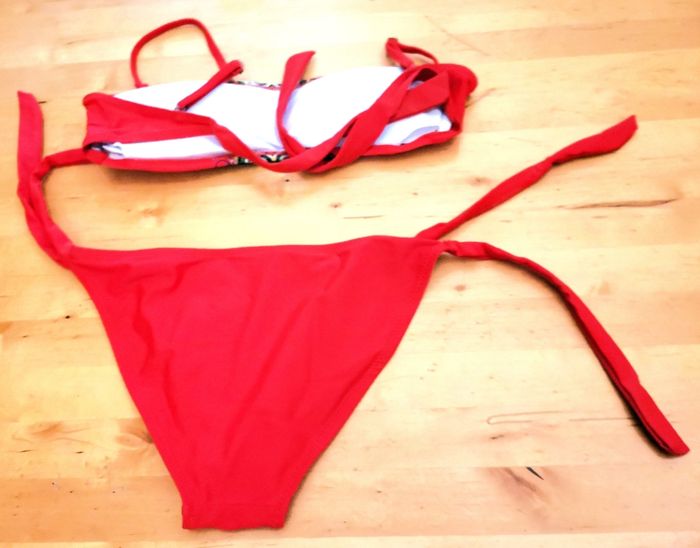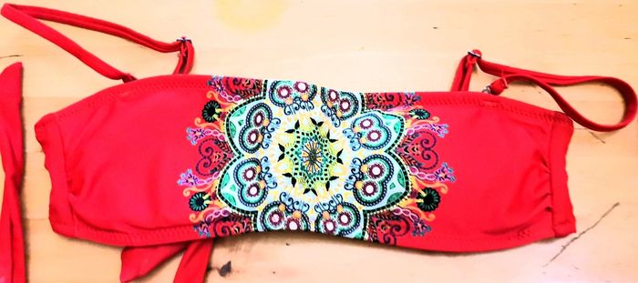 Bikini "Kiwwy" , maillot de bain 2 pièces, couleur rouge, haut bandeau à bretelles amovibles, et dos à nouer, et motif au milieu, et bas uni à nouer, taille S, quasi neuf, (étiquette coupé).
