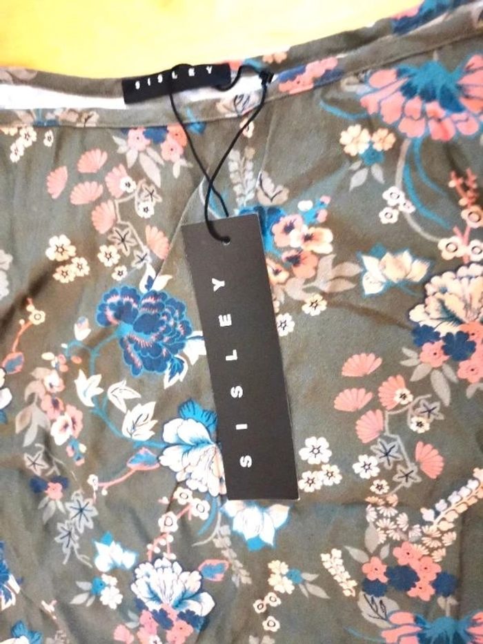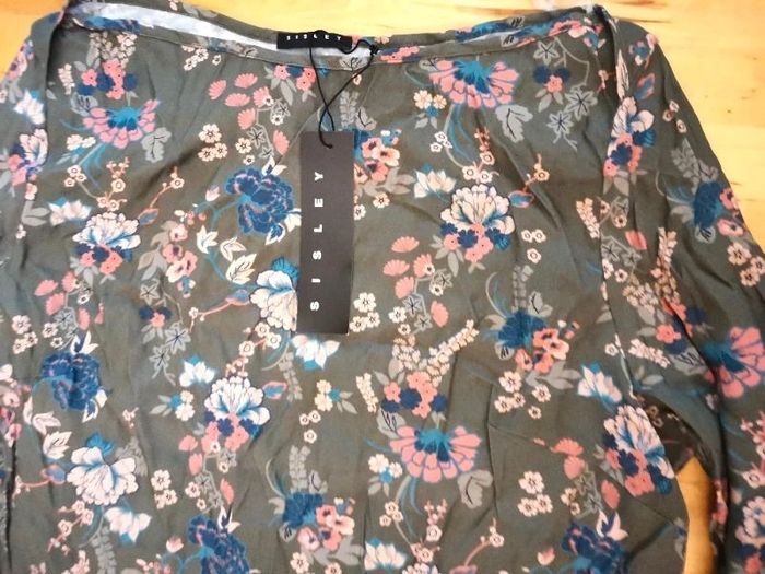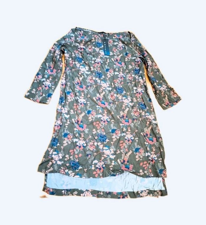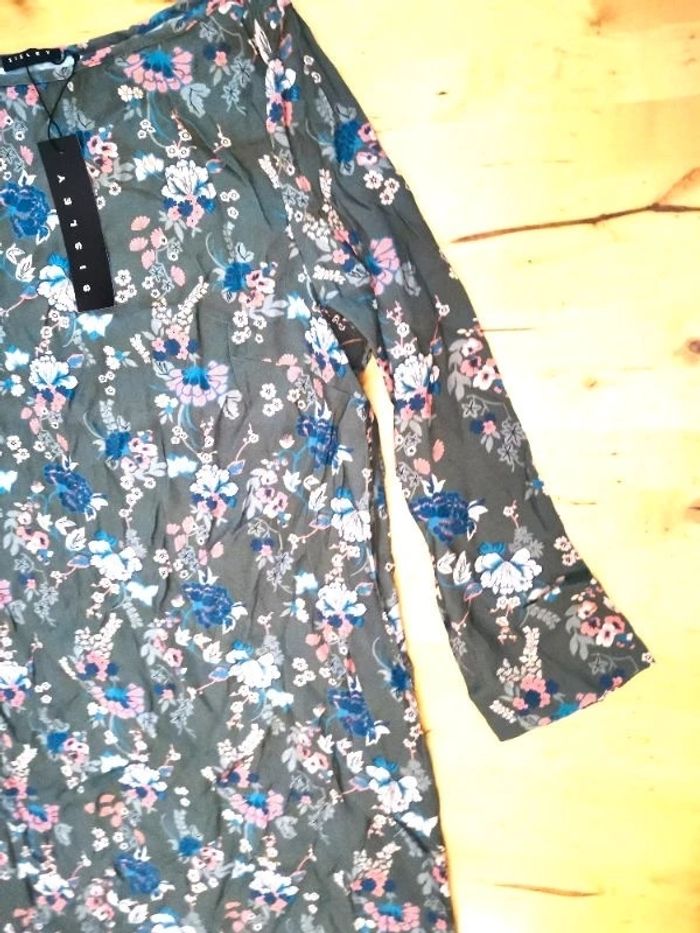Robe tunique "Sisley", à fond couleur havane à fleurs, manches longues, taille S, neuve avec étiquette, prix définitif.