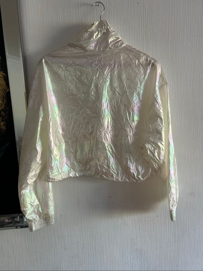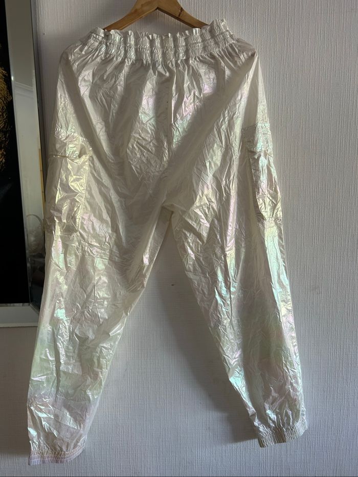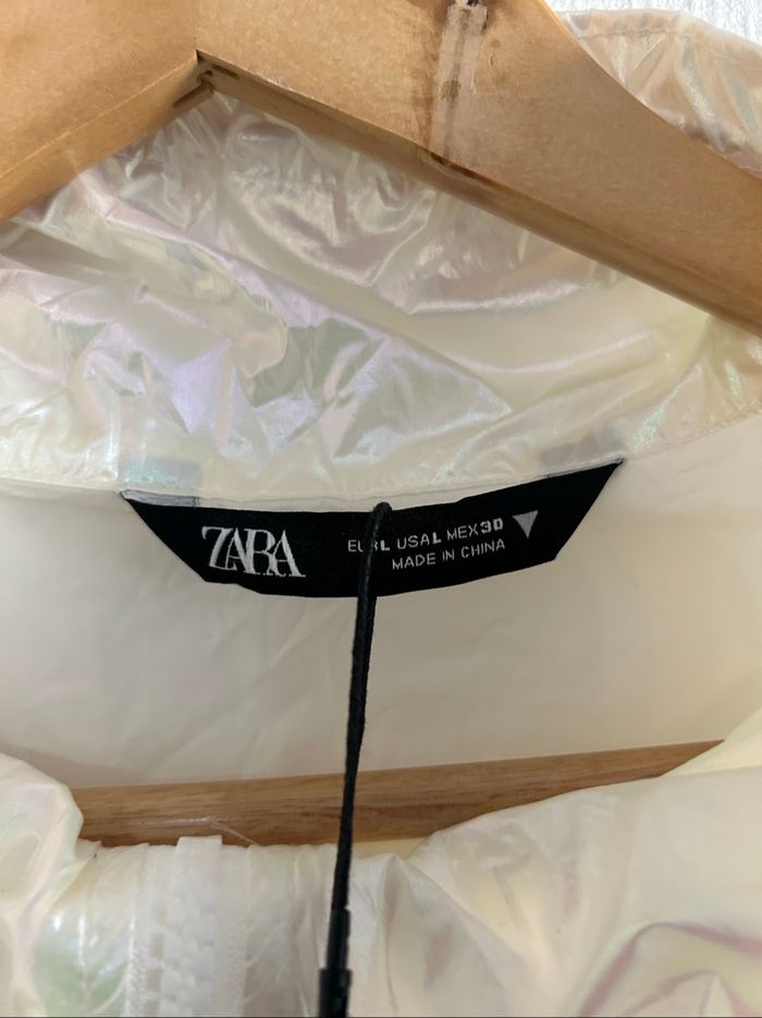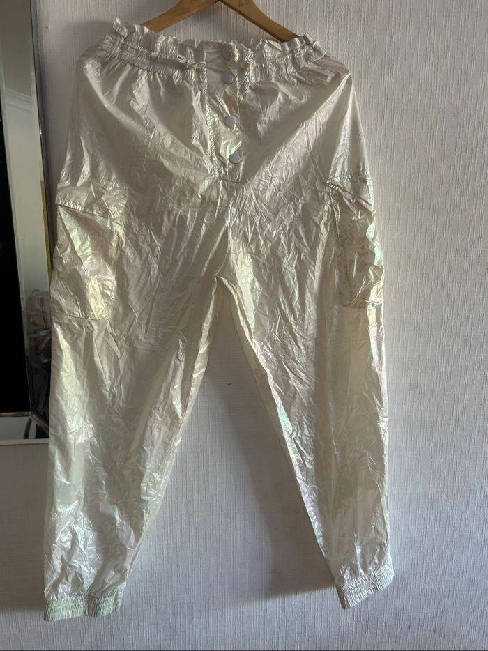 Veste argentée pour femme Zara. Survêtement coupe-vent léger Zara. Veste courte zippée. Poches cargo sur le pantalon de jogging. Veste taille L. Pantalon de jogging taille L. Veste et jogging : EUR = L / USA = L / MEX = 30