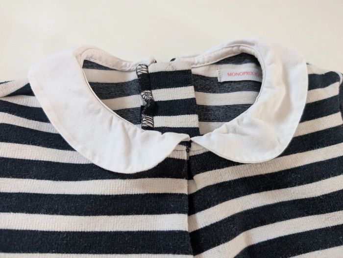 Je vends cette magnifique robe sweat en coton gratté de la marque Monoprix Kids, dans un motif marinière intemporel. Rayures bleu marine sombre blanches Col claudine Manches courtes - Type de produit : Robe coton épais - Marque : Monoprix Kids - Taille : 4 ans - Couleur : Imprimé rayures noir et blanc - Matière : Coton gratté Extensible et douce. Idéal pour la mi saison. Très bon état #yipin_fille_4ans