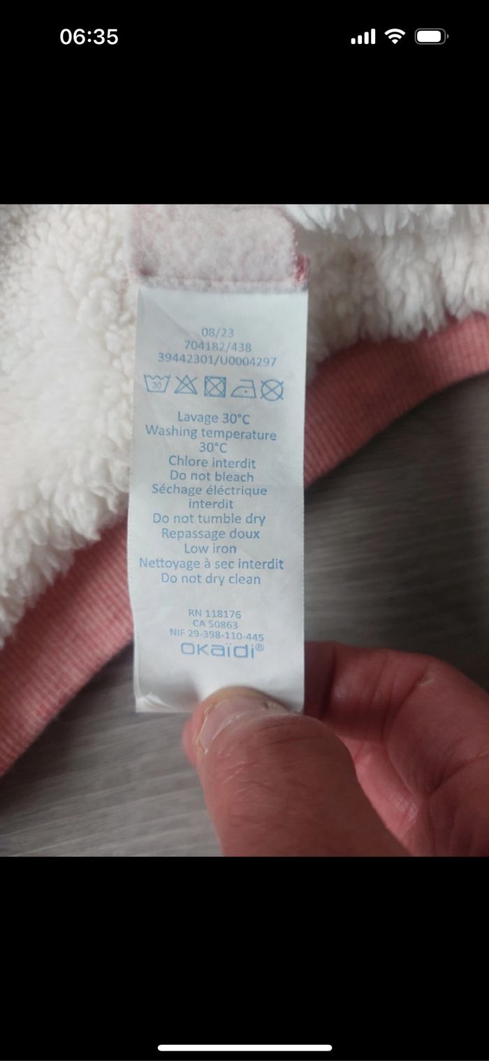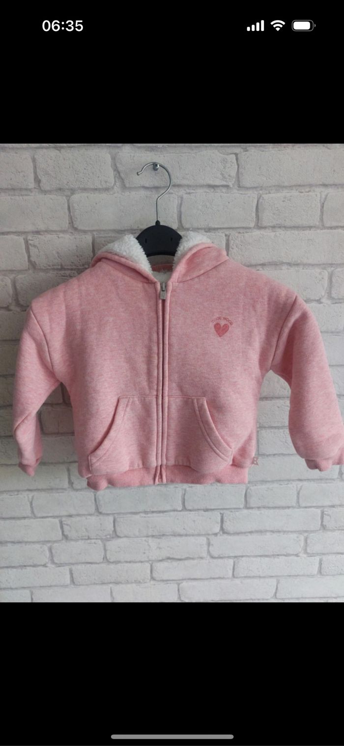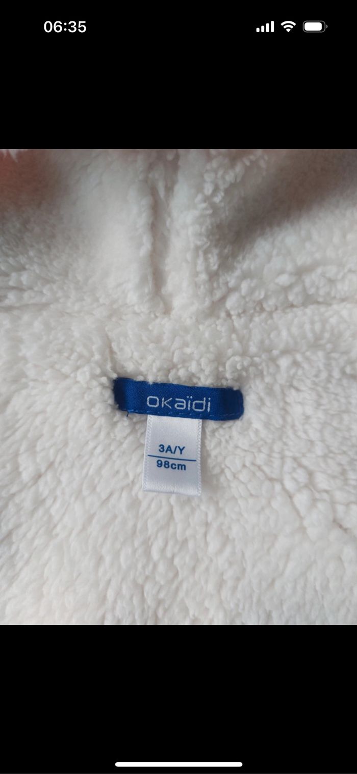 Veste fourré Okaidi taille 3 ans / 98 cm en très bon état. 70% coton 30% polyester doublure 100% polyester.