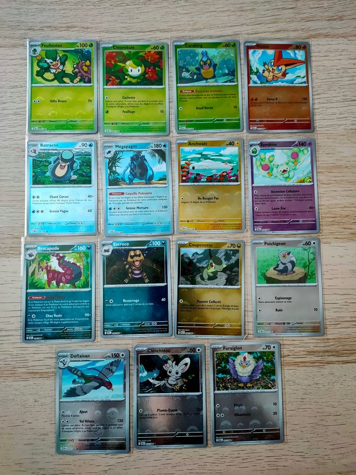 Bonjour, je vends différentes cartes Pokémon reverses Pokéball de l'extension Foudre Noire. Les cartes sont toutes officielles.  Prix du lot : 37,5€ Possible de prendre à l'unité:  2,5€/carte Prix ferme Cartes restantes : 005/086 Feuilloutan 006/086 Chlorobule 009/086 Carabing 012/086 Victini 020/086 Batracné 023/086 Mégapagos 030/086 Anchwatt 039/086 Symbios 056/086 Brutapode 058/086 Escroco 068/086 Coupenotte 071/086 Poichigeon 073/086 Déflaisan 075/086 Chinchidou 077/086 Furaiglon Plus de photos possibles sur demande  Livraison possible via le relais de votre choix N'hésitez pas à regarder mes autres annonces ;)
