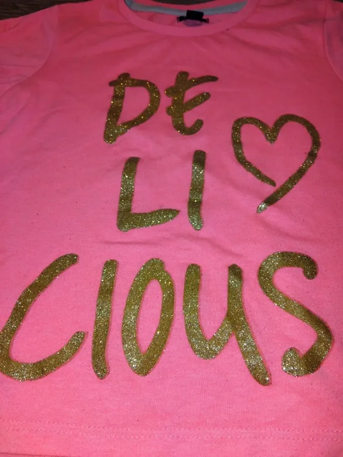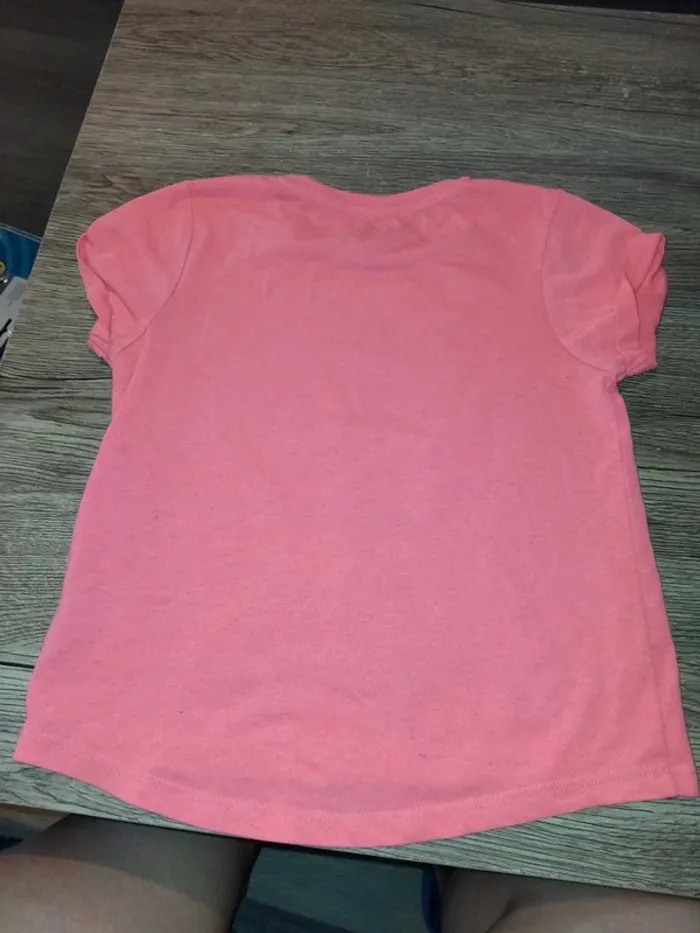 Bonjour, je vends ce tee shirt rose fluo avec écritures doré de la marque kiabi taille 4ans en très bon état.