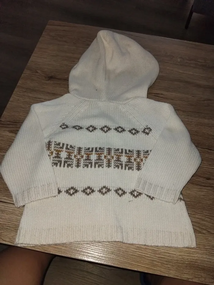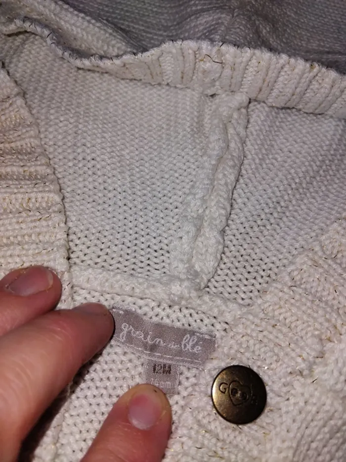 Bonjour, je vends ce gilet a capuche blanc et beige de la marque Grain de blé taille 12mois en très bon état.