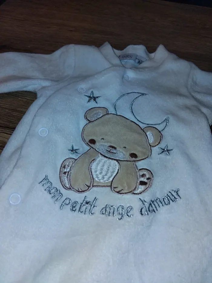 Bonjour, je vends ce pyjama blanc avec motifs de la marque Gémo taille Naissance en très bon état.
