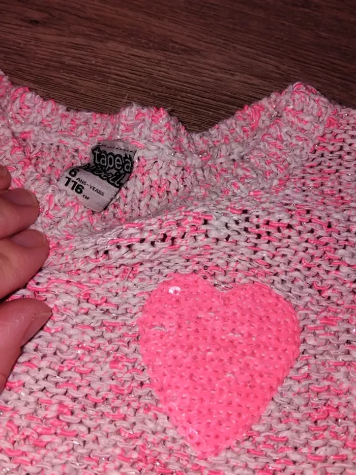 Bonjour, je vends ce pull blanc et rose de la marque tape à l'œil taille 6ans en très bon état. Lavé maison non fumeur.