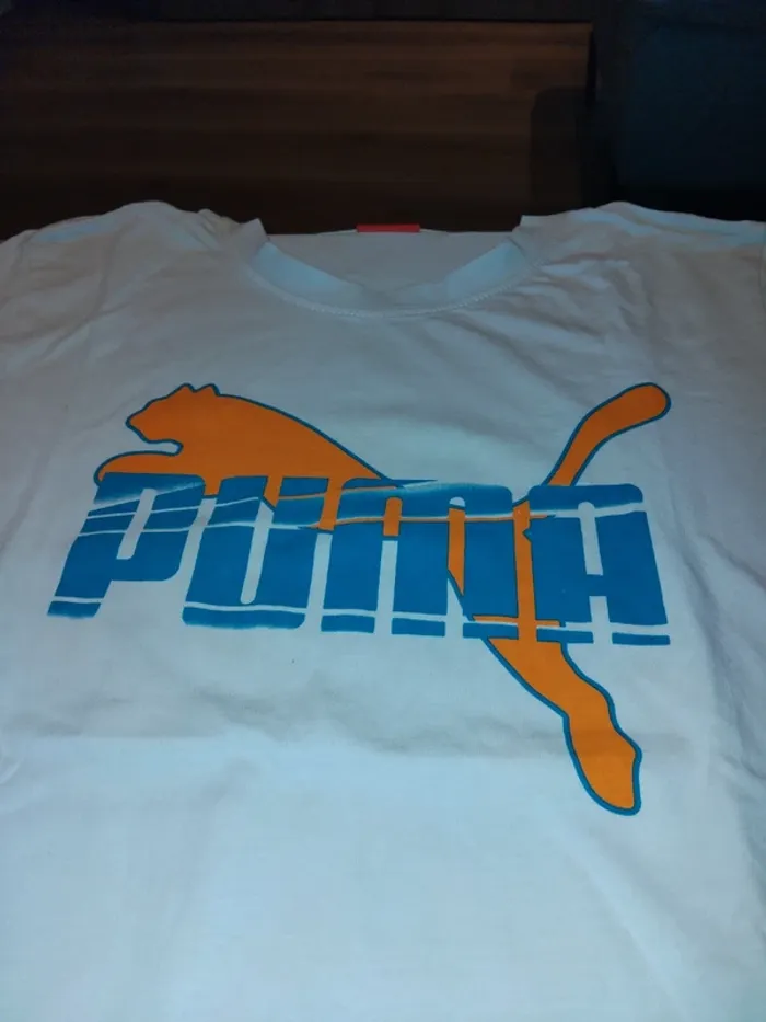 Bonjour, je vends ce tee shirt blanc bleu et orange de la marque Puma taille L en très bon état. Lavé maison non fumeur.