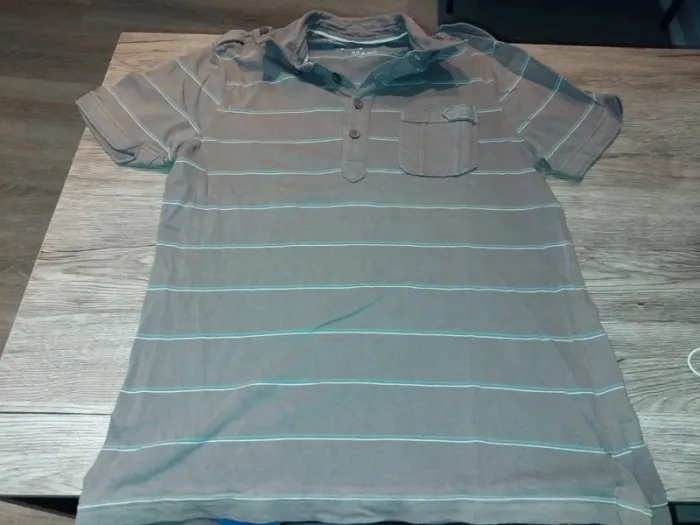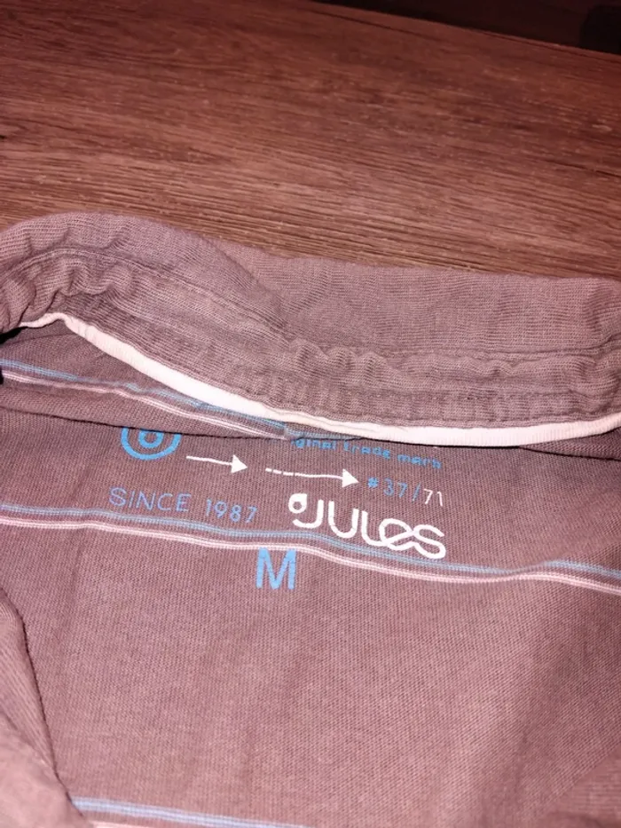 Bonjour, je vends ce polo marron blanc et turquoise de la marque Jules taille M en bon état.
