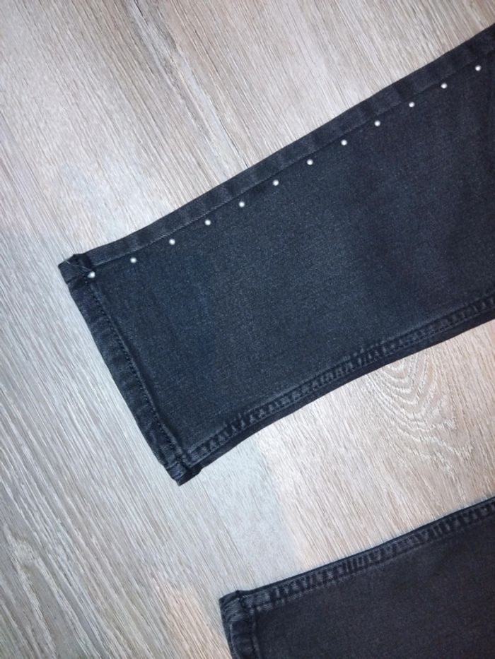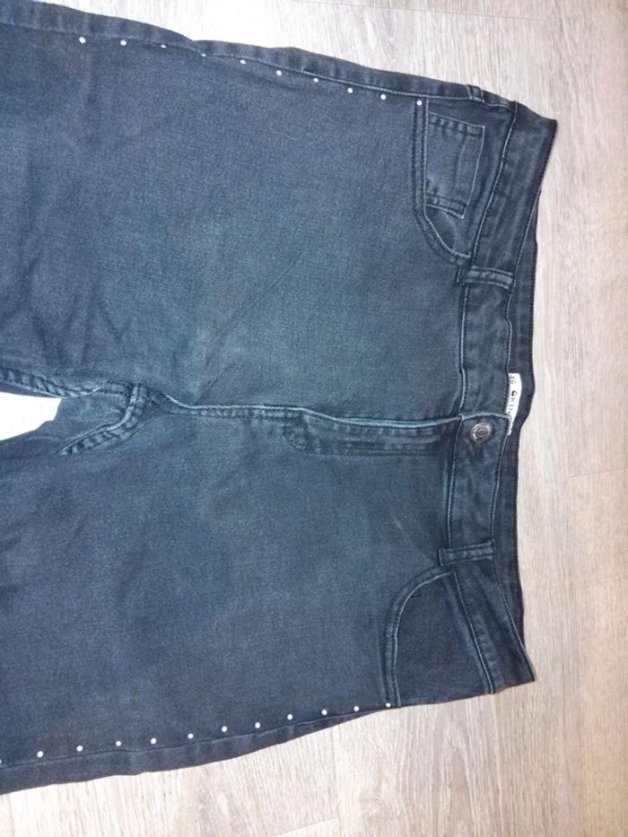 Bonjour, je vends ce jean noir avec décorations argentées le long des jambes de la marque kiabi taille 46 en très bon état.