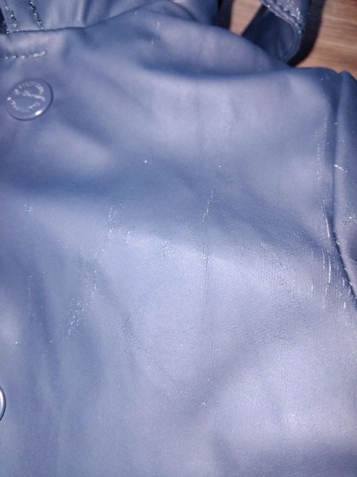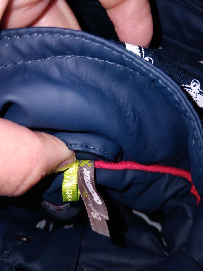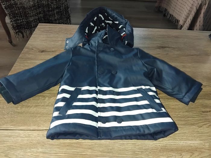 Bonjour, je vends cet imperméable marine et blanc avec capuche détachable de la marque orchestra taille 6mois en bon état (voir photo). Lavé maison non fumeur.