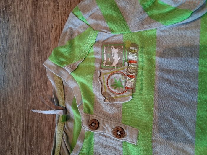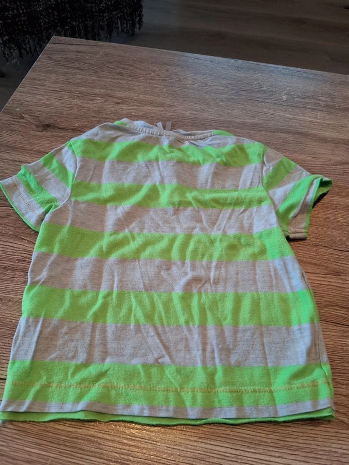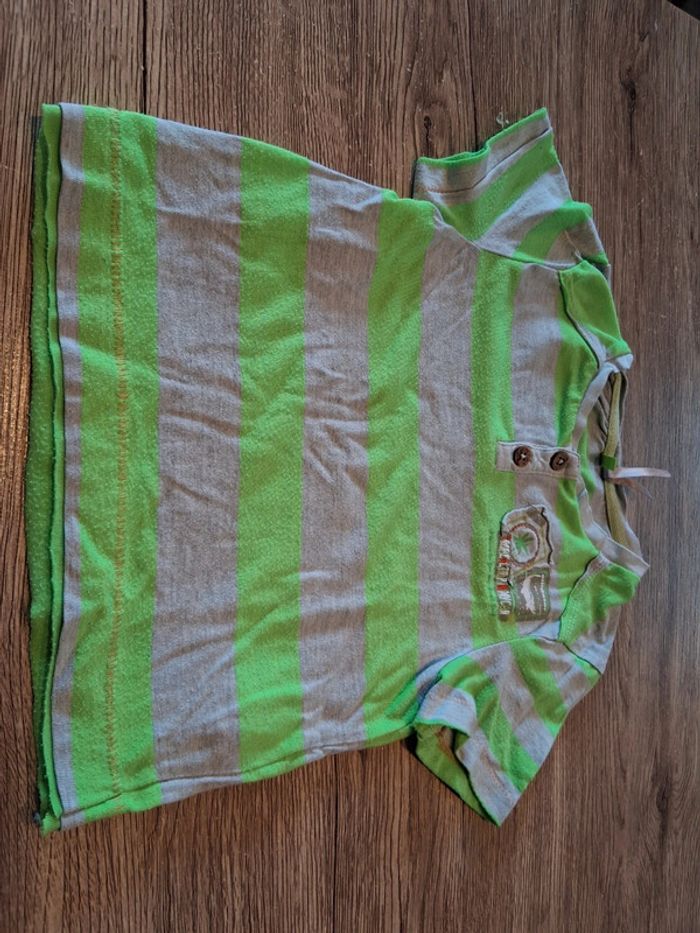 Bonjour, je vends ce tee shirt à manches courtes vert fluo et gris de la marque orchestra taille 2ans en très bon état.