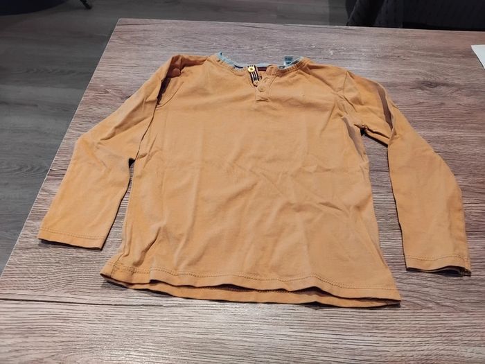 Bonjour, je vends ce tee shirt à manches longues moutarde col gris de la marque Okaïdi taille 5ans en très bon état. Lavé maison non fumeur.