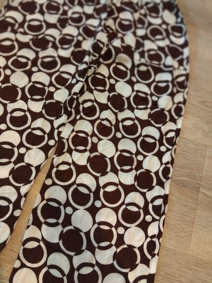 Bonjour, je vends ce pantalon fin motifs marron et blancs taille XS en très bon état. Lavé maison non fumeur.