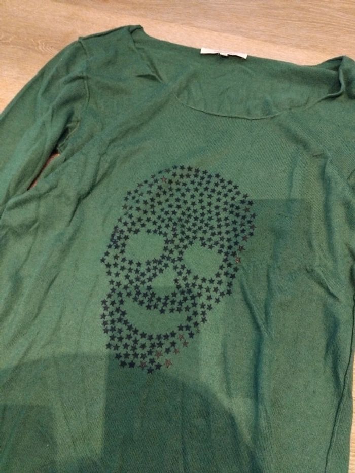 Bonjour, je vends ce tee shirt à manches longues vert motifs crâne de la marque Sud Express taille L en très bon état. Lavé maison non fumeur.