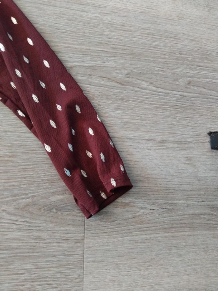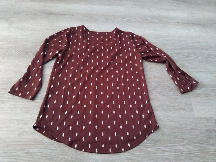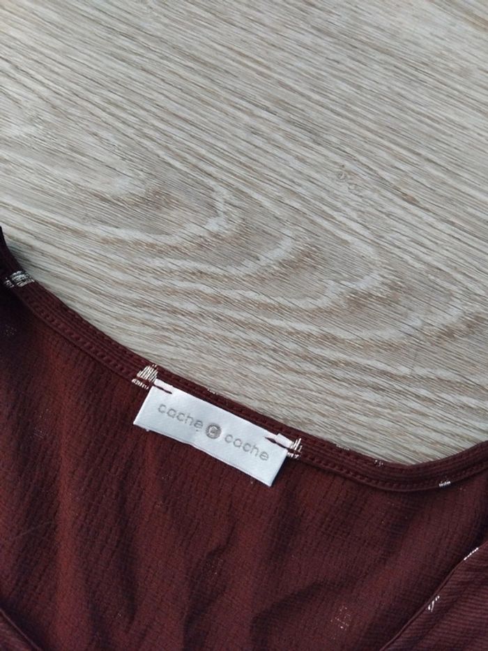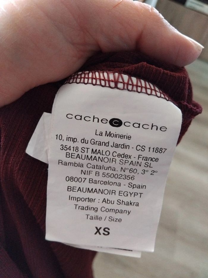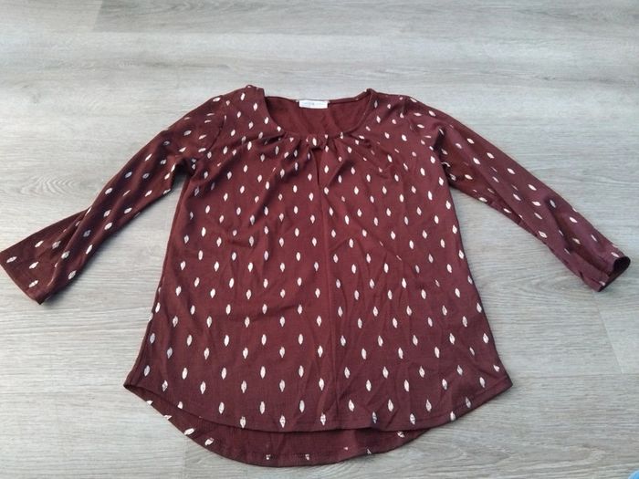 Bonjour, je vends ce tee shirt manches 3/4 bordeaux et doré de la marque cache cache taille XS en très bon état. Lavé maison non fumeur.