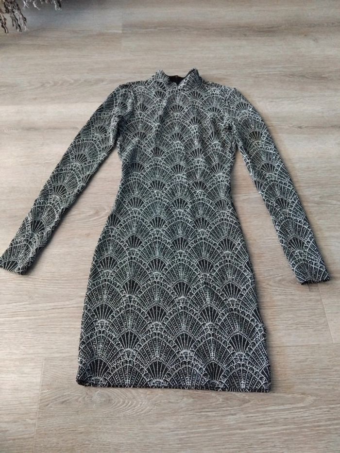 Bonjour, je vends cette robe dos nu à manches longues noire et blanche avec des strass brillants de la marque H&M taille 34 en très bon état. Lavé maison non fumeur.