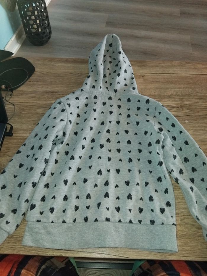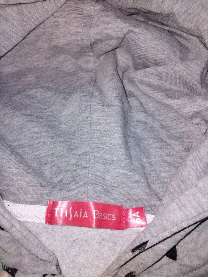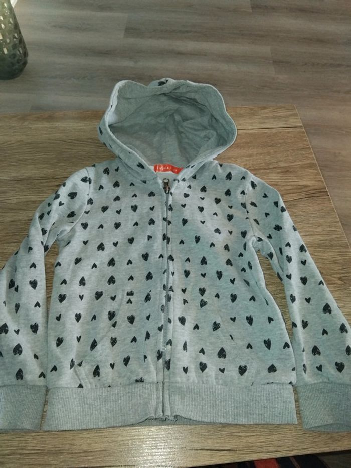 Bonjour, je vends ce gilet a capuche gris motif cœur noir de la marque Tissaia taille 6ans en très bon état. Lavé maison non fumeur.