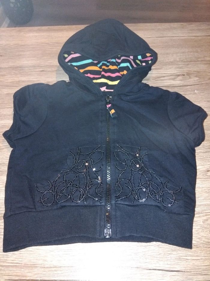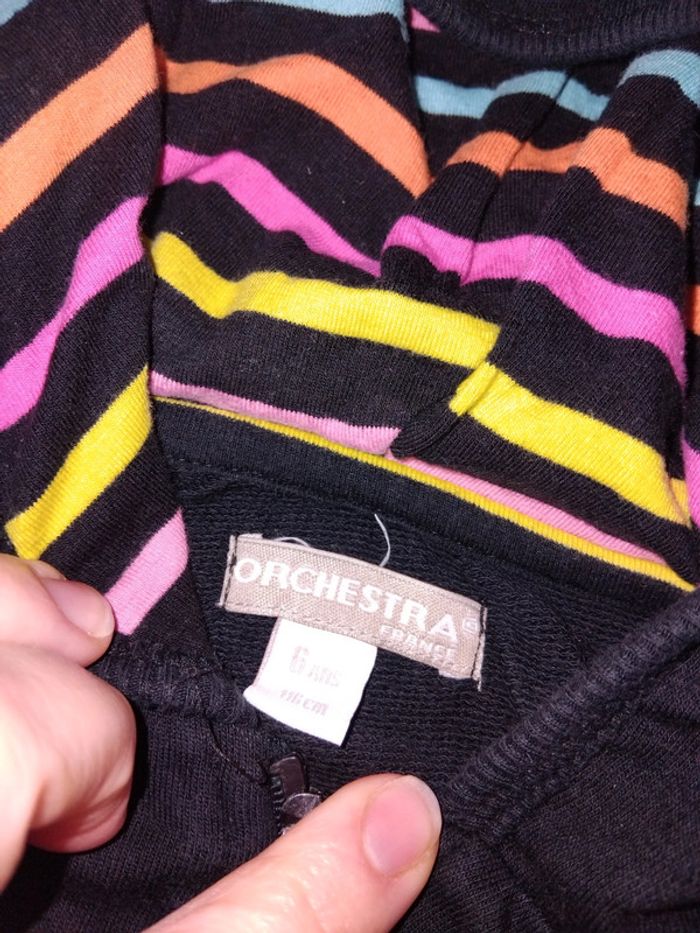 Bonjour, je vends ce gilet à manches courtes noir à capuche de la marque Orchestra taille 6ans en très bon état. Lavé maison non fumeur.