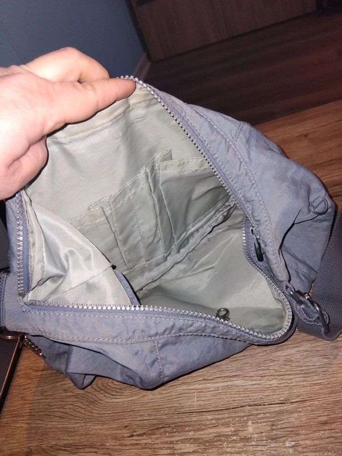 Bonjour, je vends ce sac en bandoulière gris de la marque Kipling avec plusieurs poches en bon état (tâche à l'arrière voir photo).