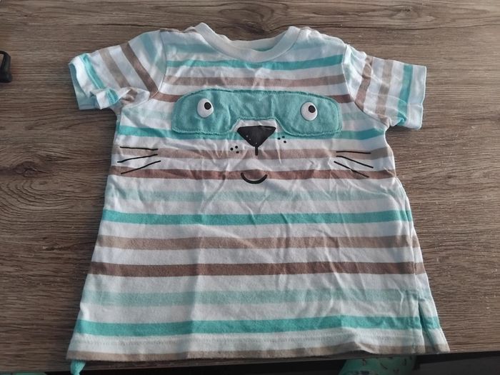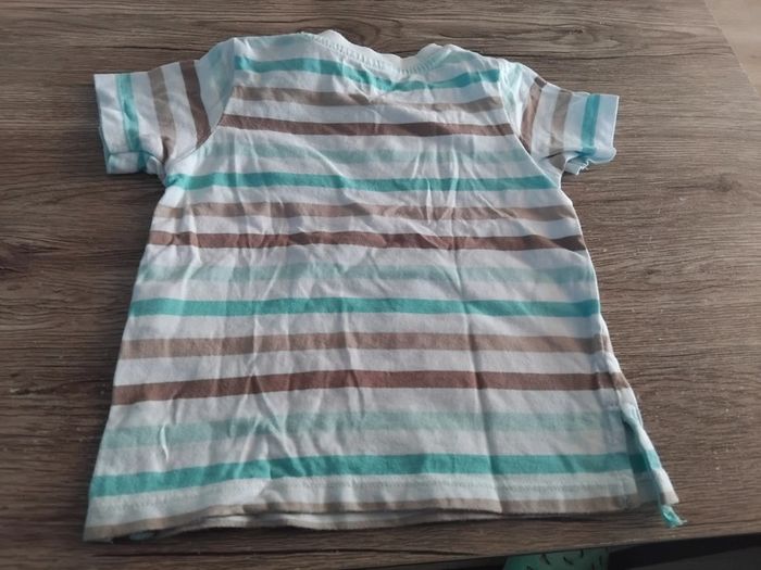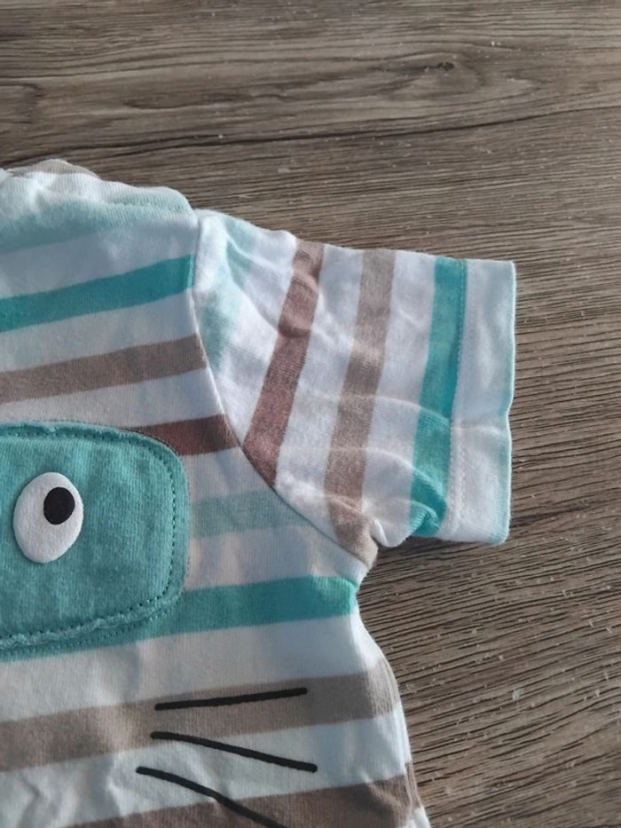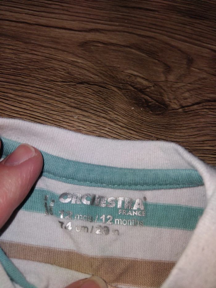 Bonjour, je vends ce tee shirt à manches courtes rayé blanc, beige et turquoise avec motif de la marque orchestra taille 12mois. Lavé maison non fumeur.