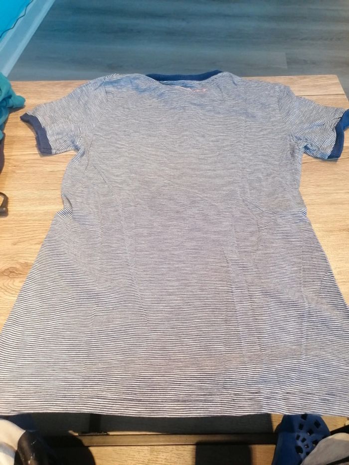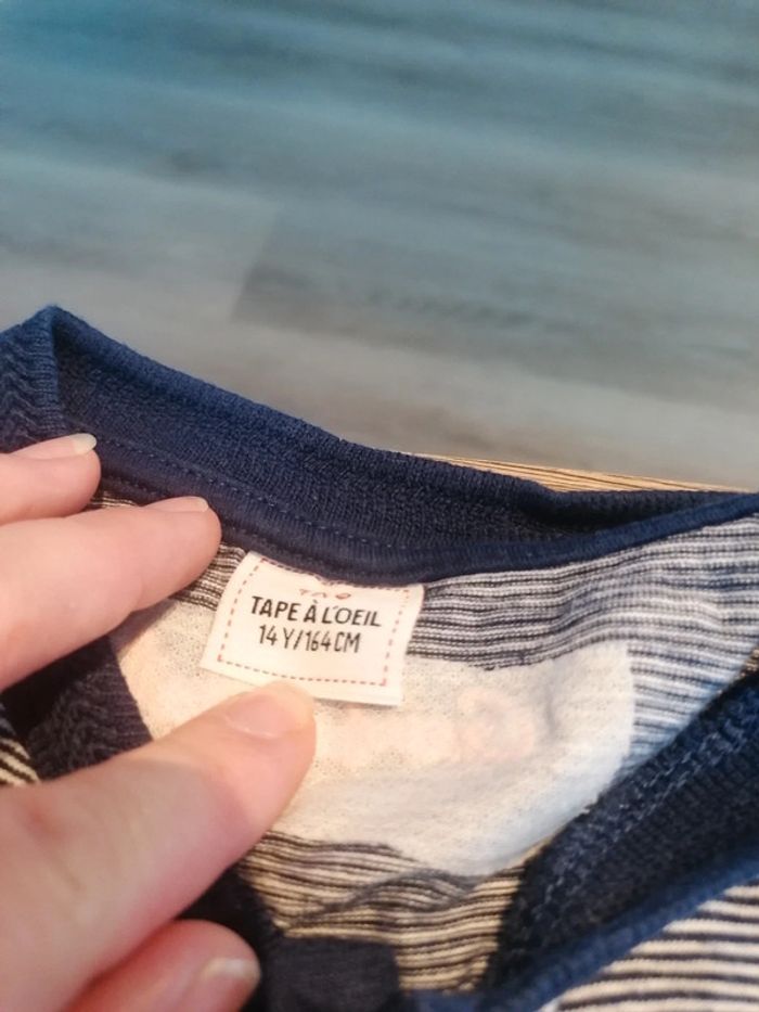 Bonjour, je vends ce tee shirt à manches courtes rayé marine et blanc de la marque Tape à l'œil taille 14ans en très bon état. Lavé maison non fumeur.