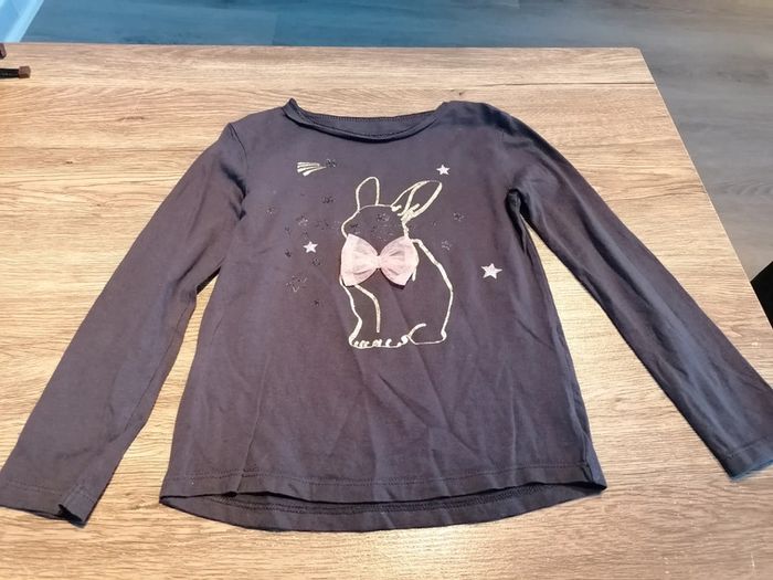 Bonjour, je vends ce tee shirt à manches longues gris motif lapin de la marque Gémo taille 6ans en très bon état. Lavé maison non fumeur.