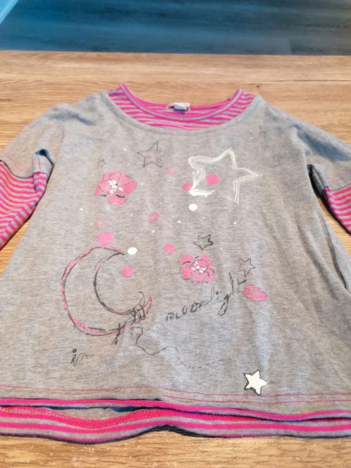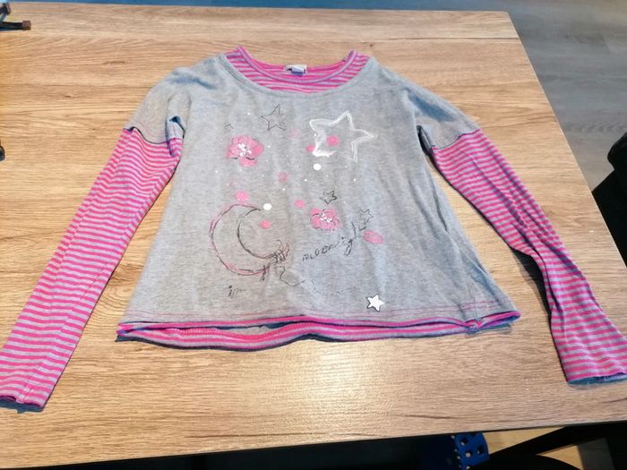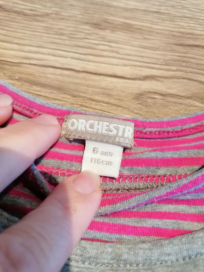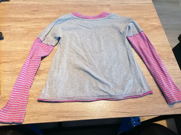 Bonjour, je vends ce tee shirt à manches longues gris et rose avec motifs de la marque Orchestra taille 6ans en très bon état. Lavé maison non fumeur.