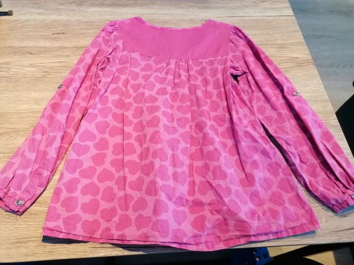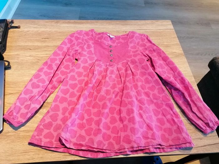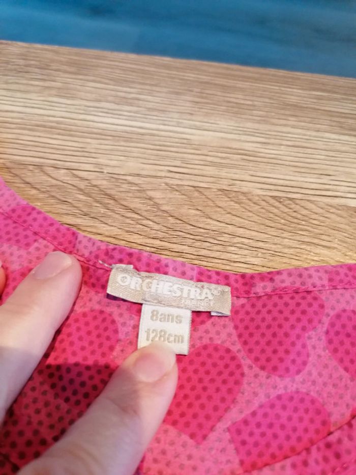 Bonjour, je vends ce tee shirt à manches longues rose motifs pois et cœurs de la marque Orchestra taille 8ans en très bon état. Lavé maison non fumeur.