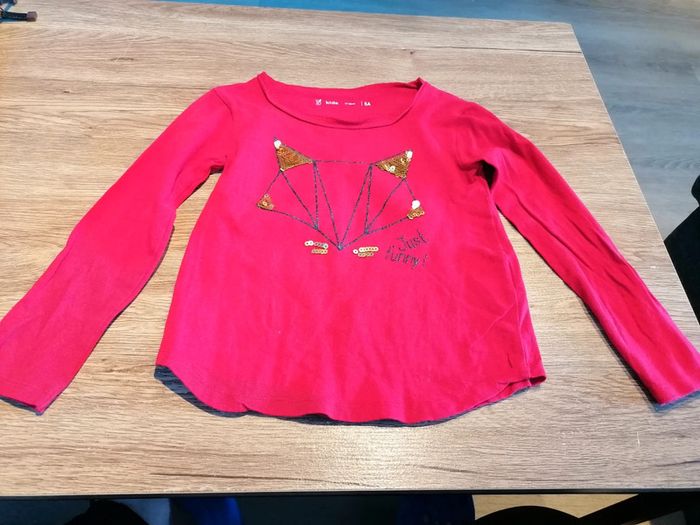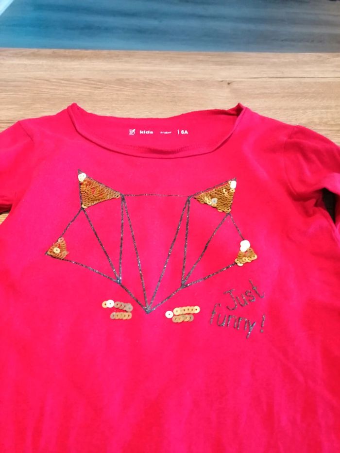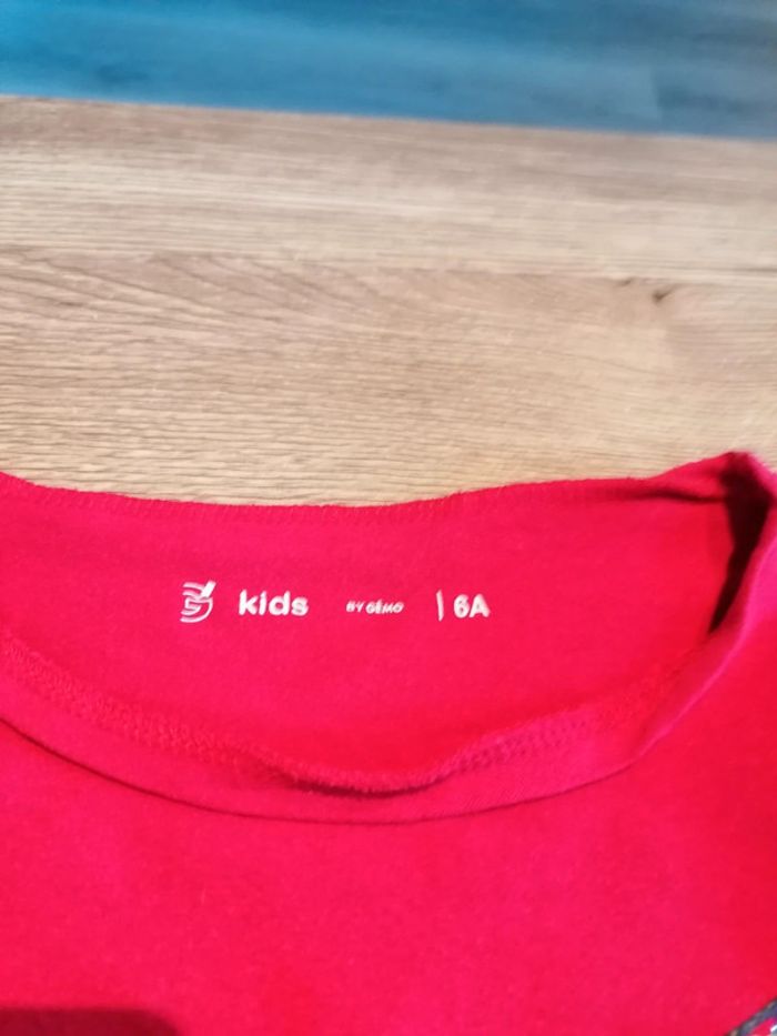 Bonjour, je vends ce tee shirt à manches longues rouge avec motifs de la marque Gémo taille 6ans en très bon état. Lavé maison non fumeur.