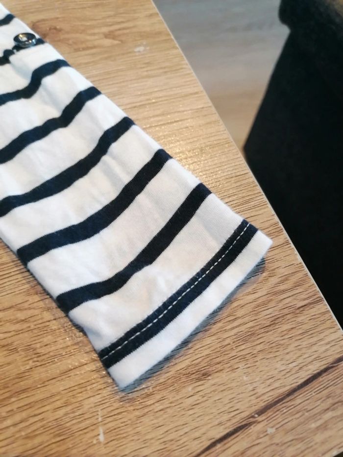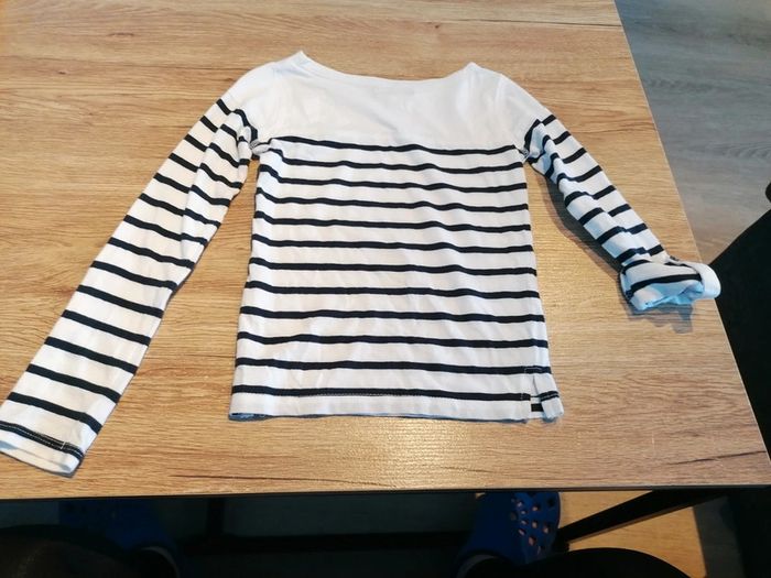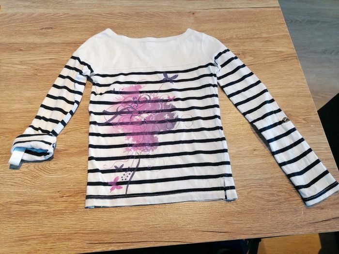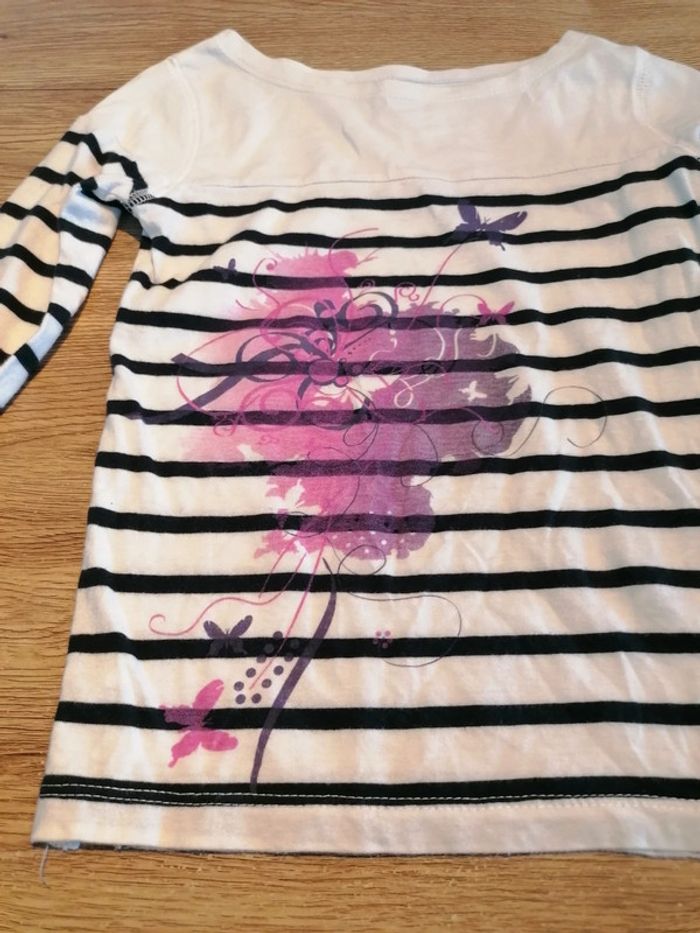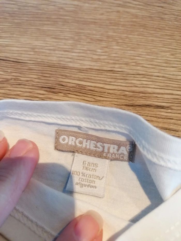 Bonjour, je vends ce tee shirt à manches longues rayé blanc et noir avec motif de la marque Orchestra taille 6ans en très bon état. Lavé maison non fumeur.